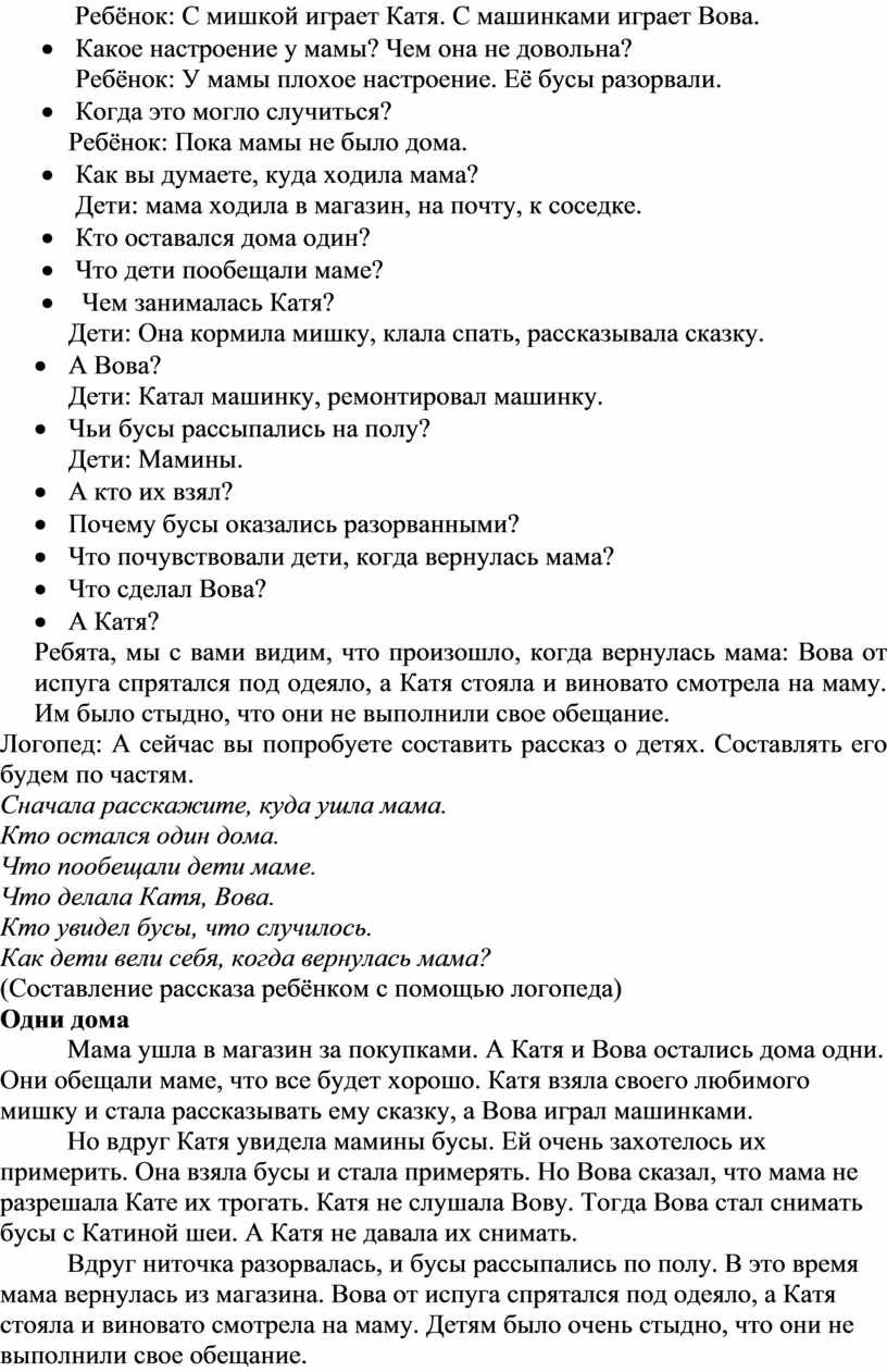 Логопед: Сегодня мы будем составлять рассказ о том, как Катя и Вова оставались дома одни.