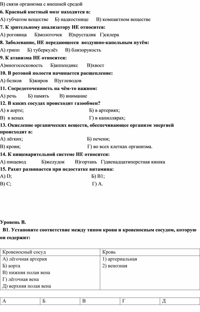 Уровень В включает 3 задания (В1- ВЗ). Первое на установление соответствия;