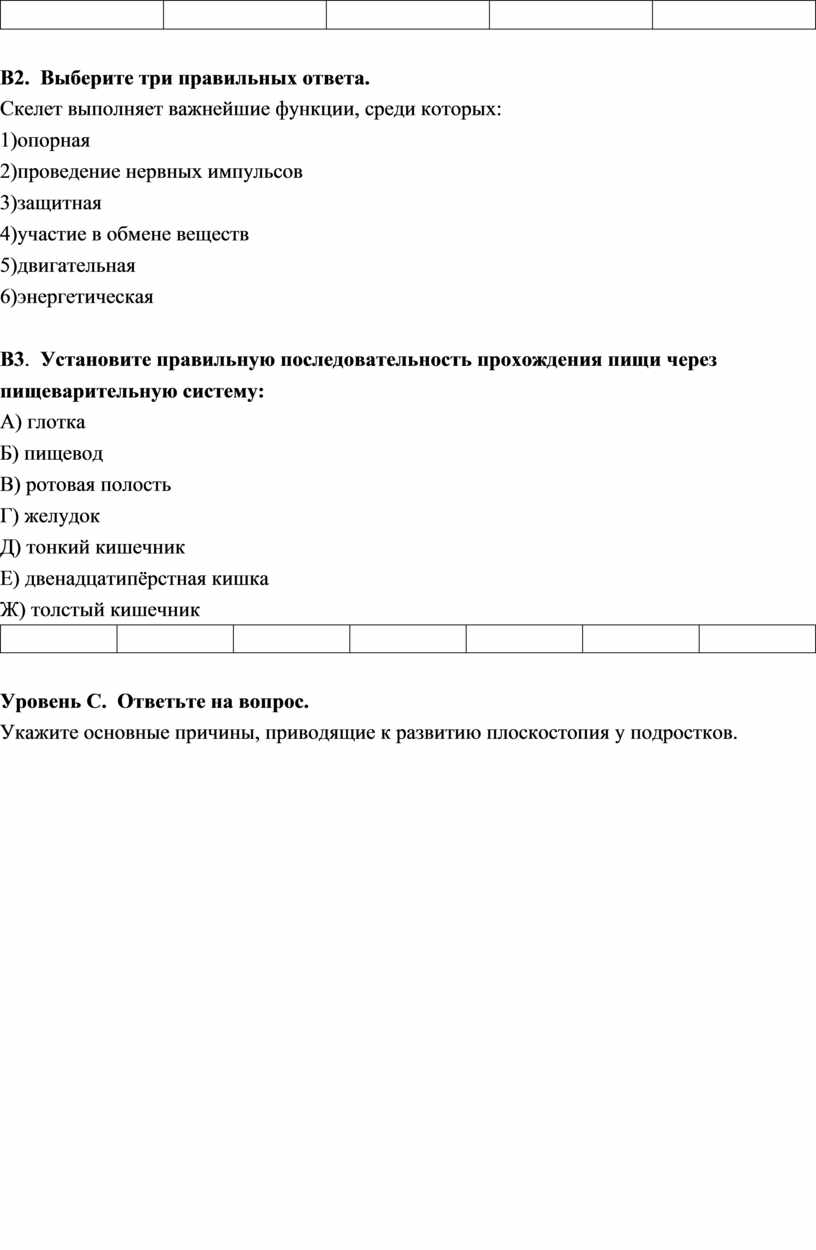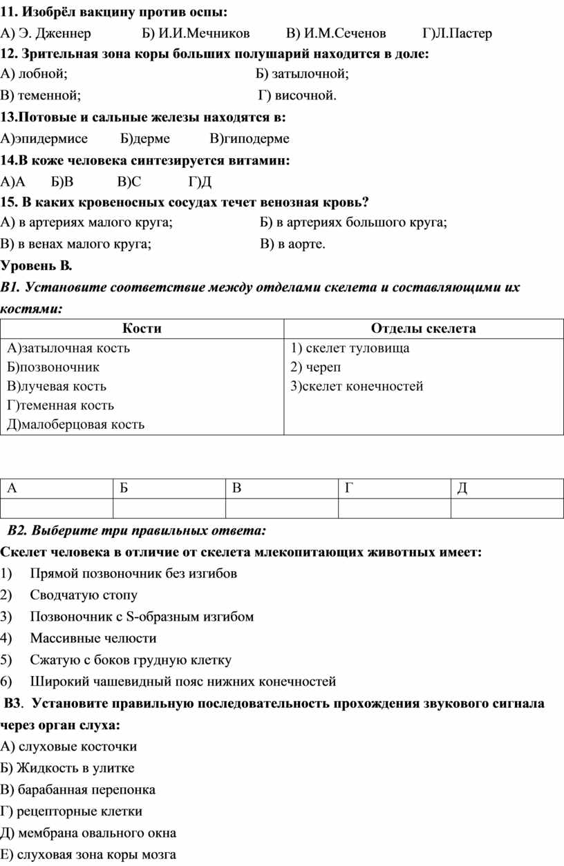 Уровень В включает 3 задания (В1- ВЗ). Первое на установление соответствия; второе - с выбором трёх правильных ответов из шести; третье - на установление правильной последовательности.