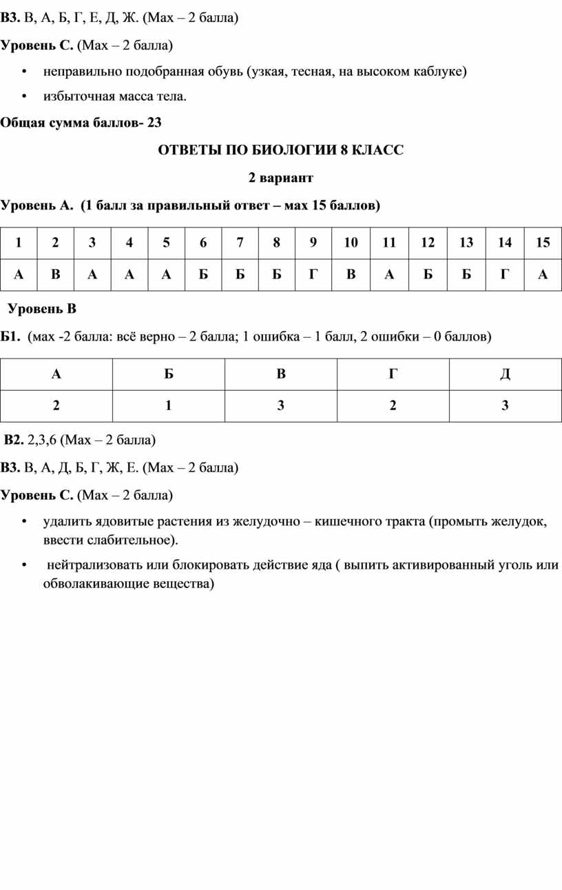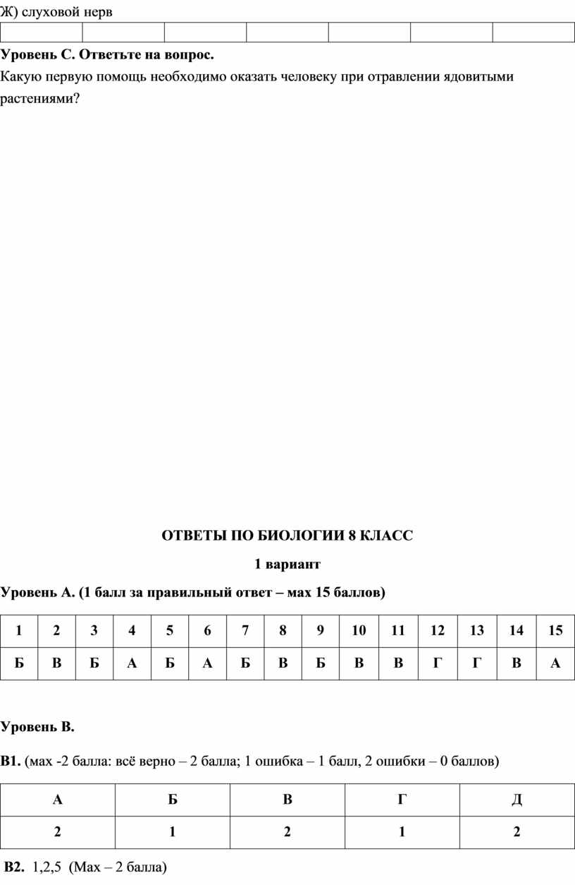 За каждый правильный ответ уровня А дается 1 балл; уровня В - всё верно - 2 балла, одна ошибка - 1 балл, 2- 0 баллов. Уровень С оценивается в 2 балла. Баллы, полученные за все задания - суммируются.