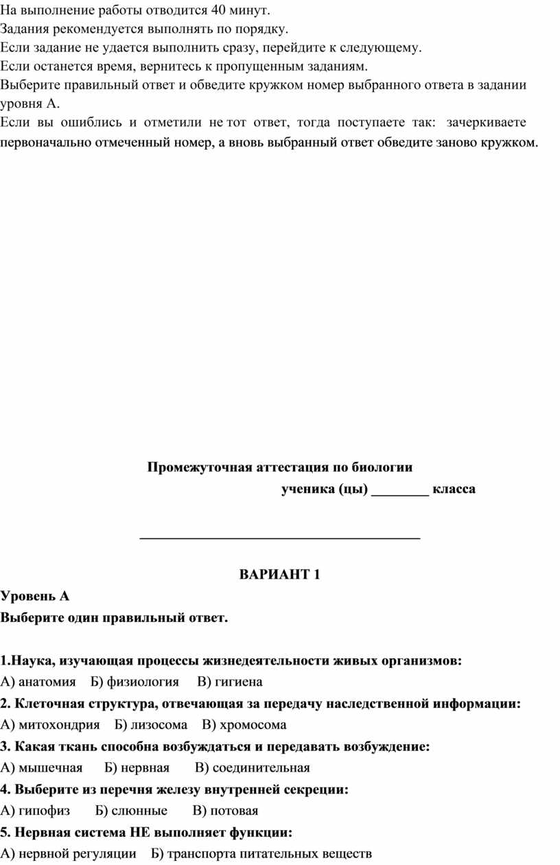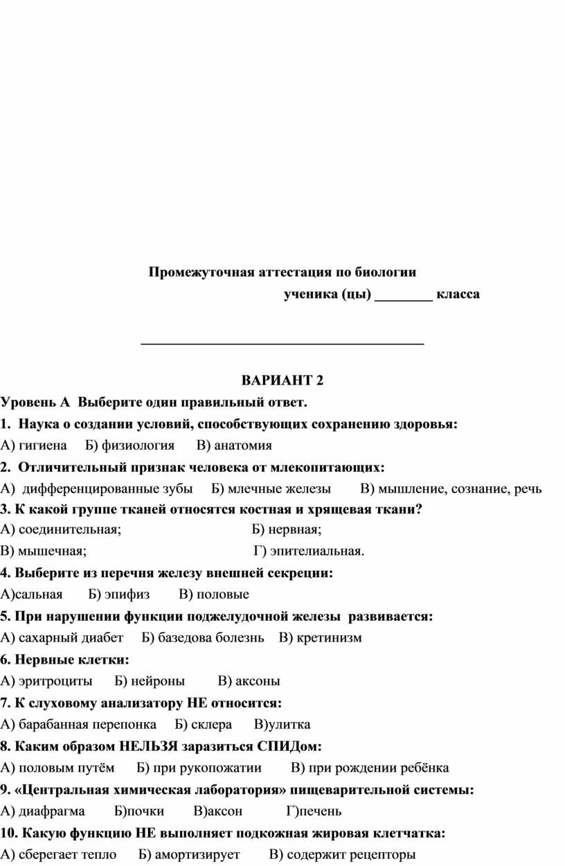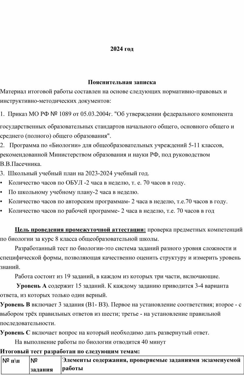 Цель проведения промежуточной аттестации: проверка предметных компетенций по биологии за курс 8 класса общеобразовательной школы.