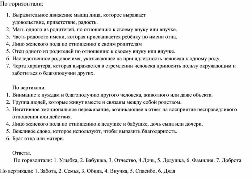 По горизонтали: 1. Улыбка, 2. Бабушка, 3. Отчество, 4.Дочь, 5. Дедушка, 6. Фамилия. 7. Доброта