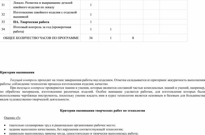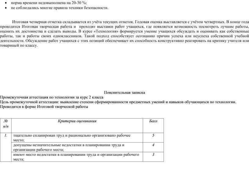 Итоговая четверная отметка складывается из учёта текущих отметок. Годовая оценка выставляется с учётом четвертных. В конце года проводится Итоговая творческая работа и проходят выставки работ учащихся, где появляется возможность посмотреть лучшие работы, оценить их достоинства и сделать выводы. В курсе «Технология» формируется умение учащихся обсуждать и оценивать как собственные работы, так и работы своих одноклассников. Такой подход способствует осознанию причин успеха или неуспеха собственной учебной деятельности. Обсуждение работ учащихся с этих позиций обеспечивает их способность конструктивно реагировать на критику учителя или товарищей по классу.