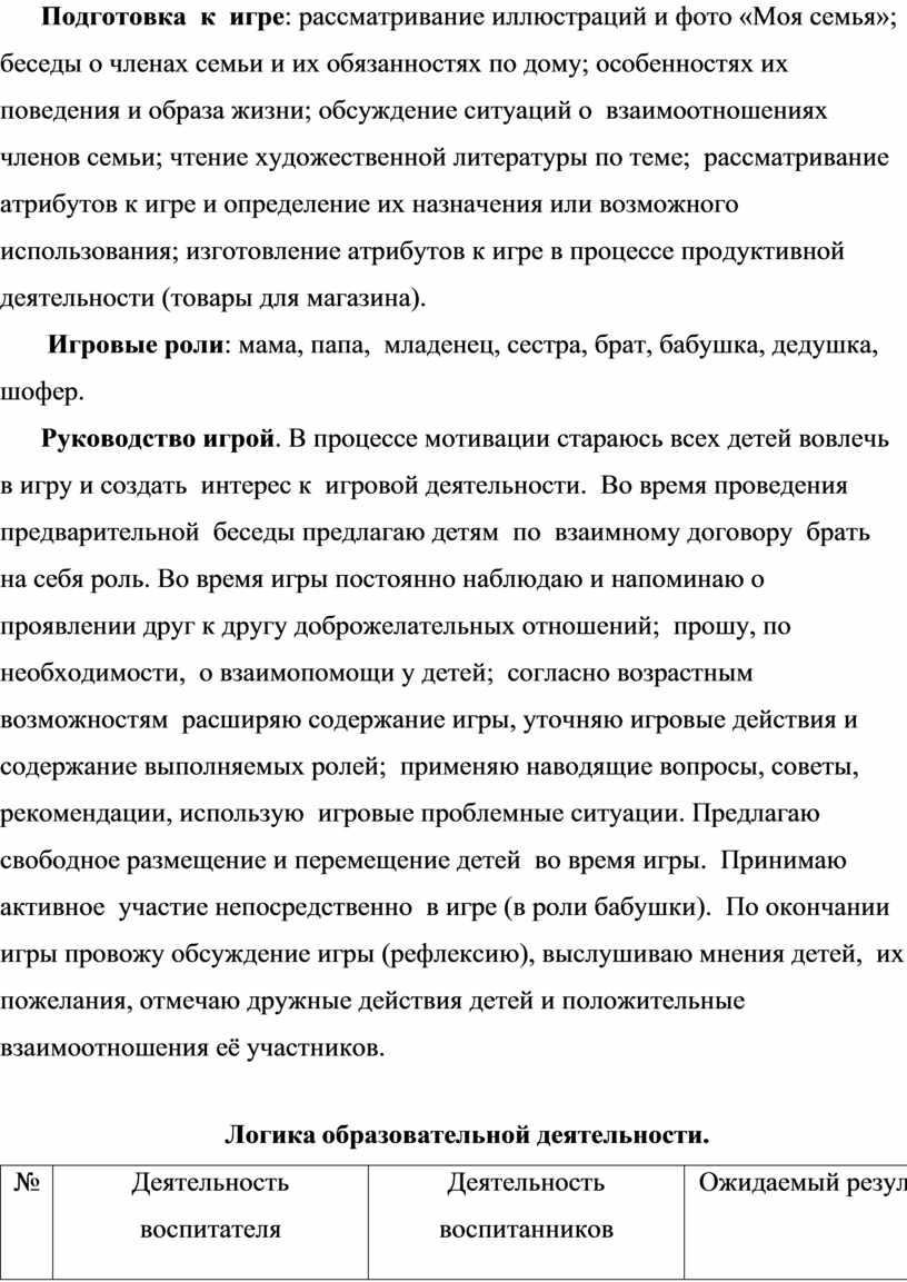 Подготовка к игре: рассматривание иллюстраций и фото «Моя семья»; беседы о членах семьи и их обязанностях по дому; особенностях их поведения и образа жизни; обсуждение ситуаций о взаимоотношениях членов семьи; чтение художественной литературы по теме; рассматривание атрибутов к игре и определение их назначения или возможного использования; изготовление атрибутов к игре в процессе продуктивной деятельности (товары для магазина).