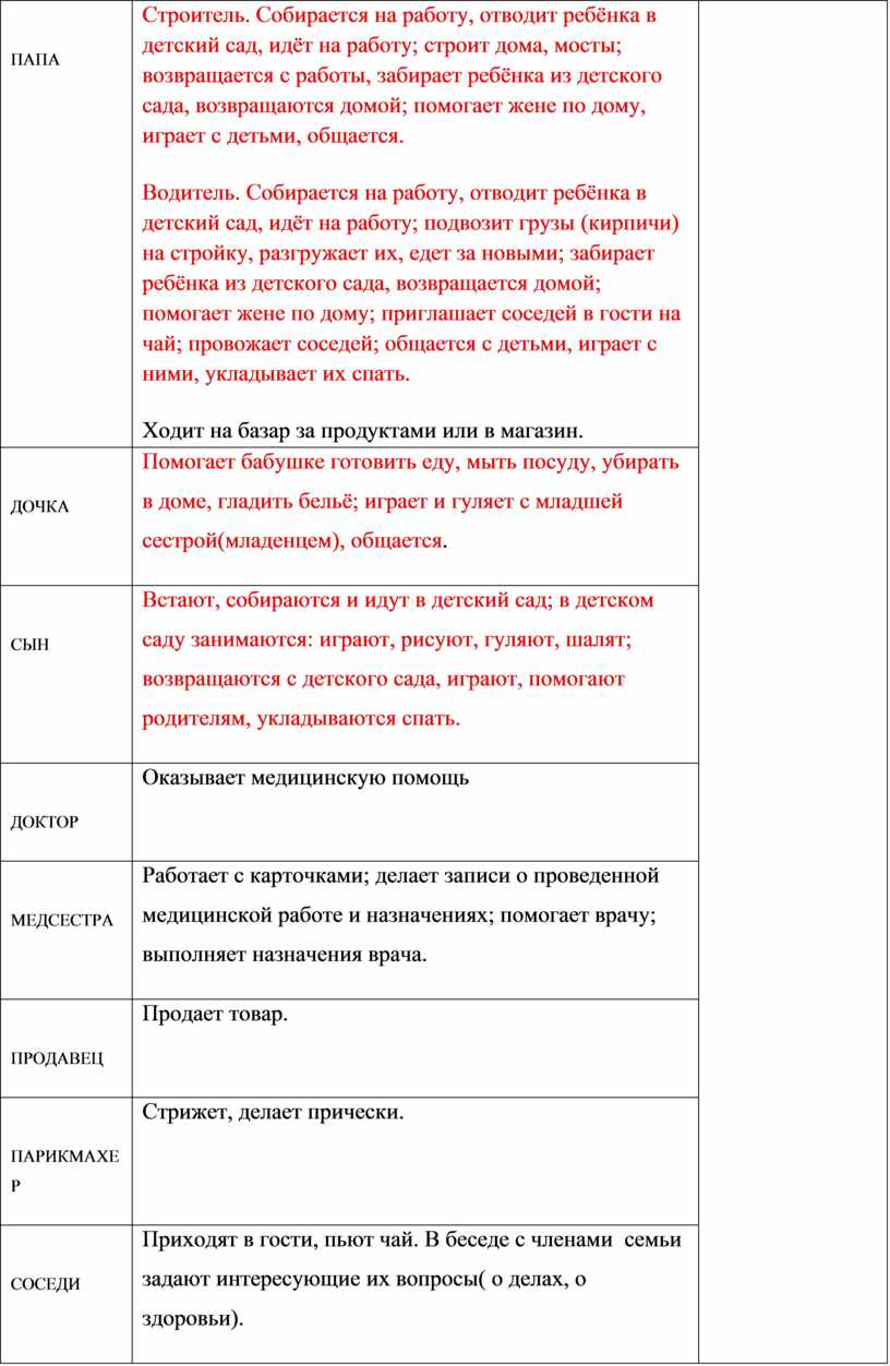 Строитель. Собирается на работу, отводит ребёнка в детский сад, идёт на работу; строит дома, мосты; возвращается с работы, забирает ребёнка из детского сада, возвращаются домой; помогает жене по дому, играет с детьми, общается. Водитель. Собирается на работу, отводит ребёнка в детский сад, идёт на работу; подвозит грузы (кирпичи) на стройку, разгружает их, едет за новыми; забирает ребёнка из детского сада, возвращается домой; помогает жене по дому; приглашает соседей в гости на чай; провожает соседей; общается с детьми, играет с ними, укладывает их спать. Ходит на базар за продуктами или в магазин. |