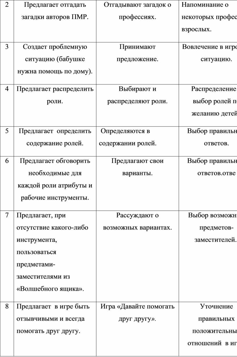 Домохозяйка. Собирает и провожает дочку в детский сад, мужа на работу; ухаживает за младшим ребёнком (кукла), гуляет с ним, убирает в доме, готовит еду; встречает ребёнка из детского сада, мужа с работы; кормит их, общается, укладывает детей спать. Воспитатель.Собирается и идёт на работу; готовит всё необходимое для занятий с детьми; принимает детей, занимается с ними; играет, гуляет, рисует, учит т т.д.; отдаёт детей родителям, убирает рабочее место; возвращается с работы домой; отдыхает, общается со своими детьми и мужем; помогает бабушке, укладывает детей спать. |