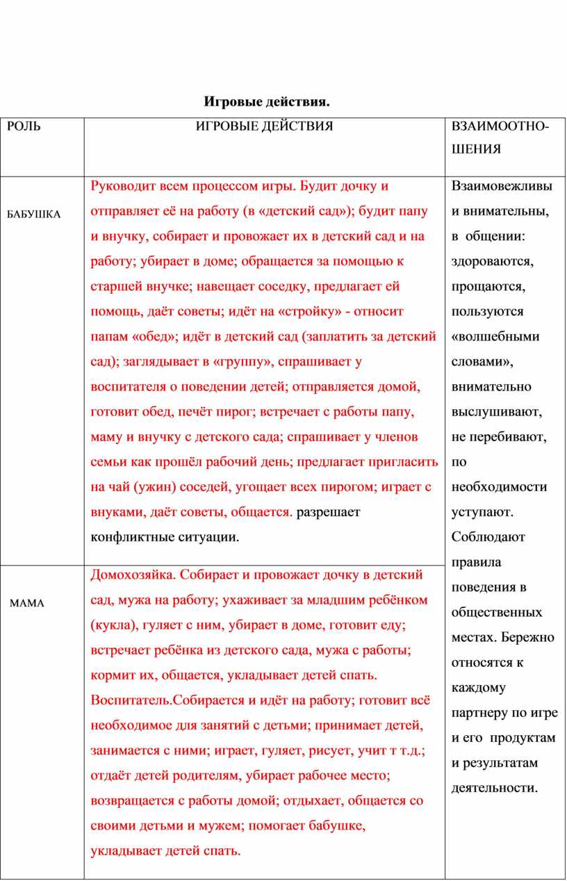 Руководит всем процессом игры. Будит дочку и отправляет её на работу (в «детский сад»); будит папу и внучку, собирает и провожает их в детский сад и на работу; убирает в доме; обращается за помощью к старшей внучке; навещает соседку, предлагает ей помощь, даёт советы; идёт на «стройку» - относит папам «обед»; идёт в детский сад (заплатить за детский сад); заглядывает в «группу», спрашивает у воспитателя о поведении детей; отправляется домой, готовит обед, печёт пирог; встречает с работы папу, маму и внучку с детского сада; спрашивает у членов семьи как прошёл рабочий день; предлагает пригласить на чай (ужин) соседей, угощает всех пирогом; играет с внуками, даёт советы, общается. разрешает конфликтные ситуации. |