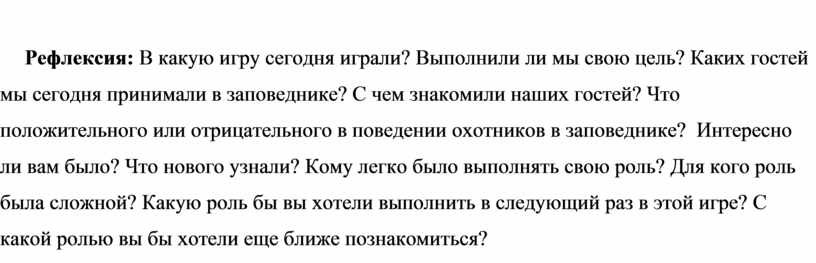 Рефлексия: В какую игру сегодня играли? Выполнили ли мы свою цель? Каких гостей мы сегодня принимали в заповеднике? С чем знакомили наших гостей? Что положительного или отрицательного в поведении охотников в заповеднике? Интересно ли вам было? Что нового узнали? Кому легко было выполнять свою роль? Для кого роль была сложной? Какую роль бы вы хотели выполнить в следующий раз в этой игре? С какой ролью вы бы хотели еще ближе познакомиться?