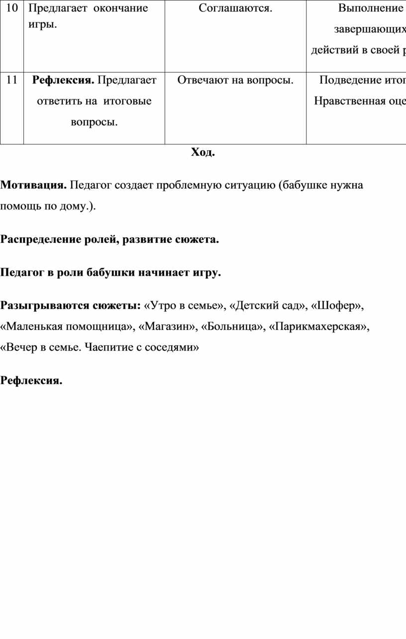 Руководство игрой. В процессе мотивации стараюсь всех детей вовлечь в игру и создать интерес к игровой деятельности. Во время проведения предварительной беседы предлагаю детям по взаимному договору брать на себя роль. Во время игры постоянно наблюдаю и напоминаю о проявлении друг к другу доброжелательных отношений; прошу, по необходимости, о взаимопомощи у детей; согласно возрастным возможностям расширяю содержание игры, уточняю игровые действия и содержание выполняемых ролей; применяю наводящие вопросы, советы, рекомендации, использую игровые проблемные ситуации. Предлагаю свободное размещение и перемещение детей во время игры. Принимаю активное участие непосредственно в игре (в роли бабушки). По окончании игры провожу обсуждение игры (рефлексию), выслушиваю мнения детей, их пожелания, отмечаю дружные действия детей и положительные взаимоотношения её участников.