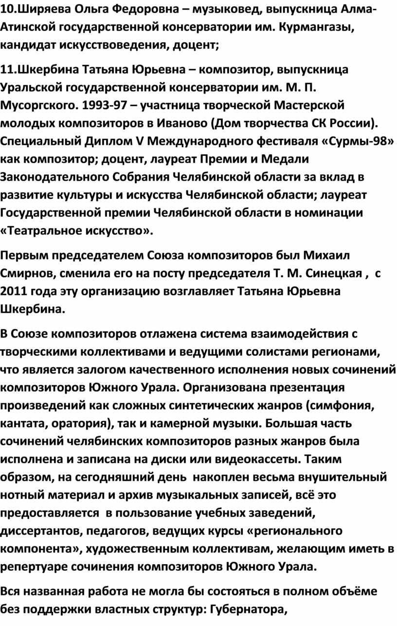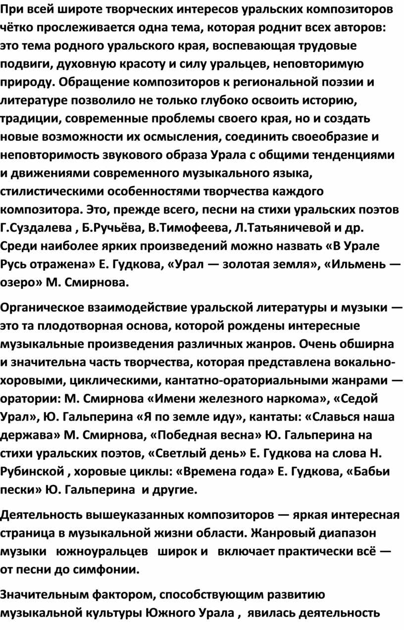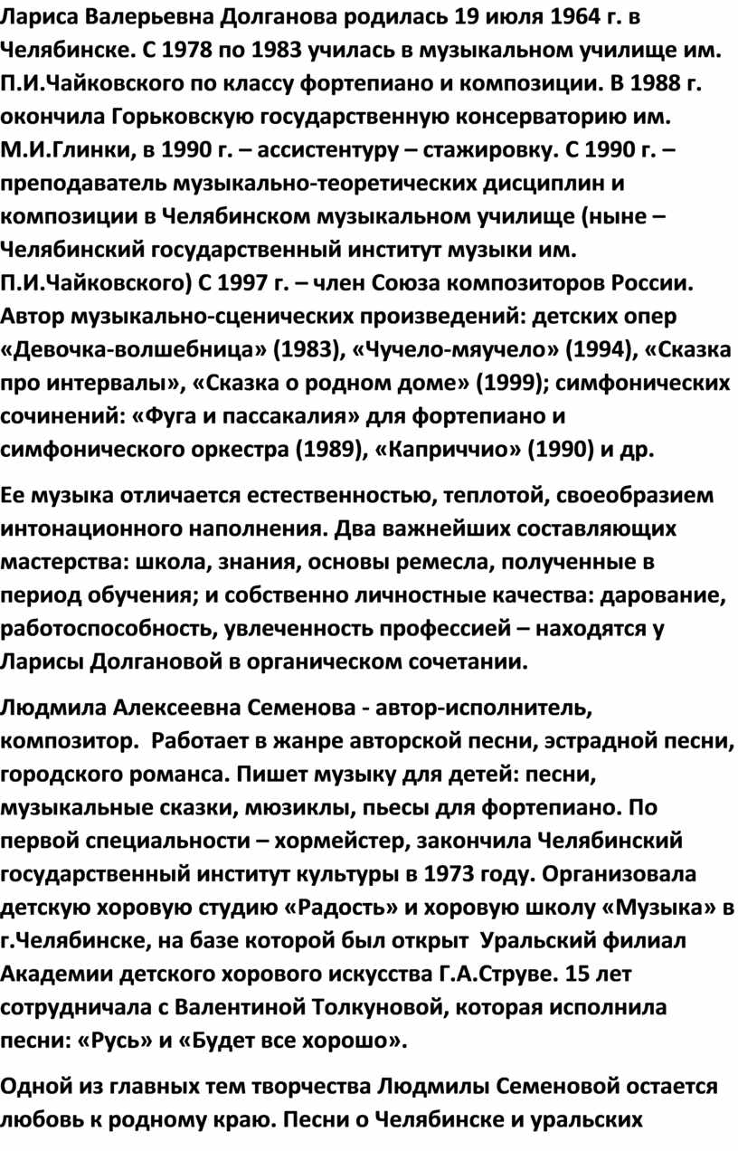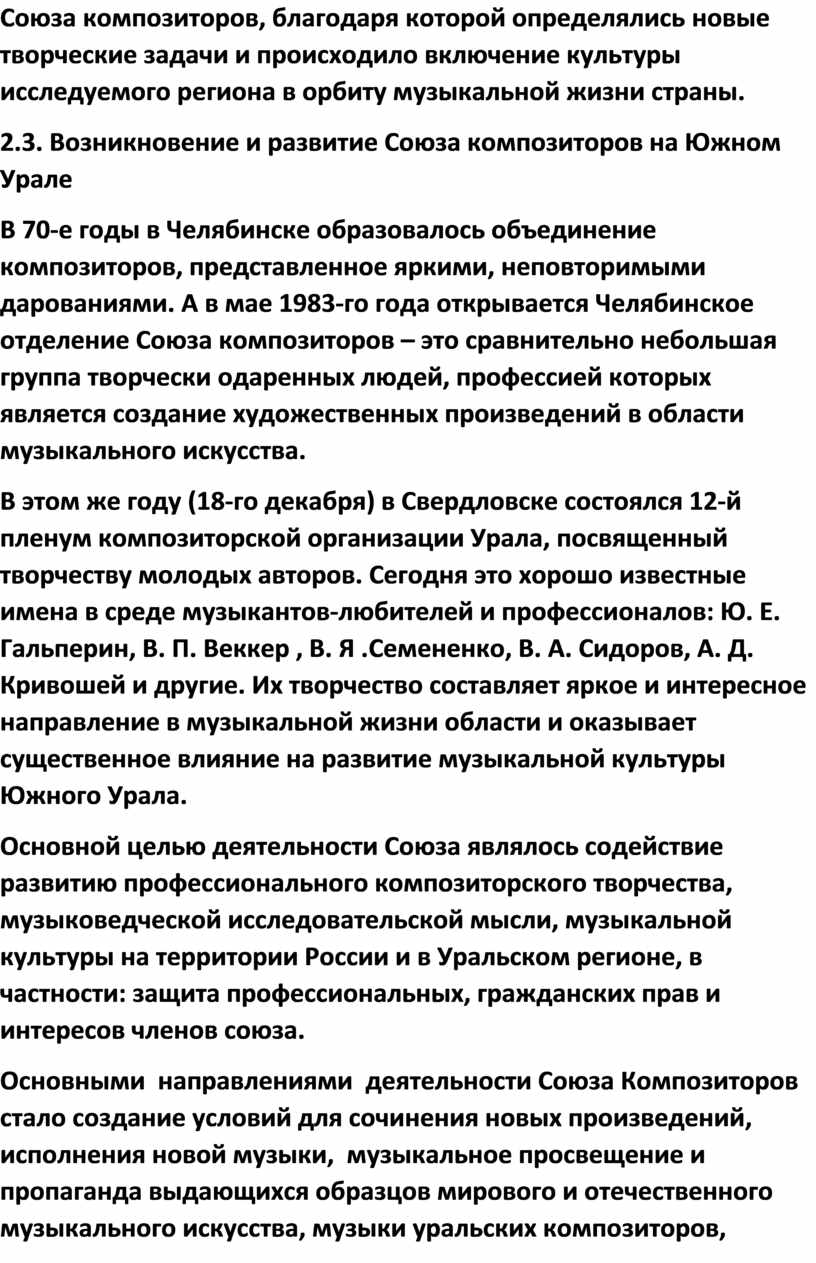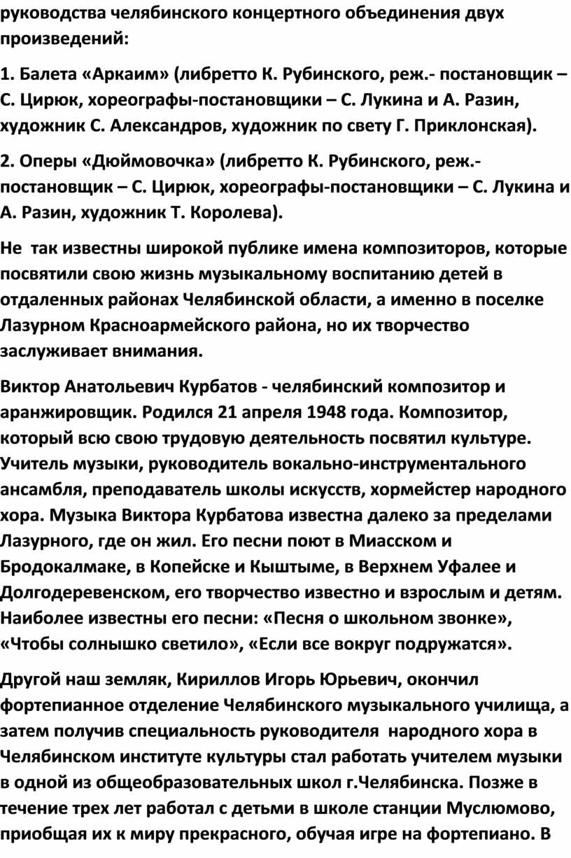 Изучение художественной культуры и музыкального искусства Южного Урала, в частности города Челябинска, является одной из проблем музыкознания на современном этапе. Нельзя любить свой край и не знать талантливых его представителей, их музыкальные произведения, основные направления и жанры их музыкальных сочинений.