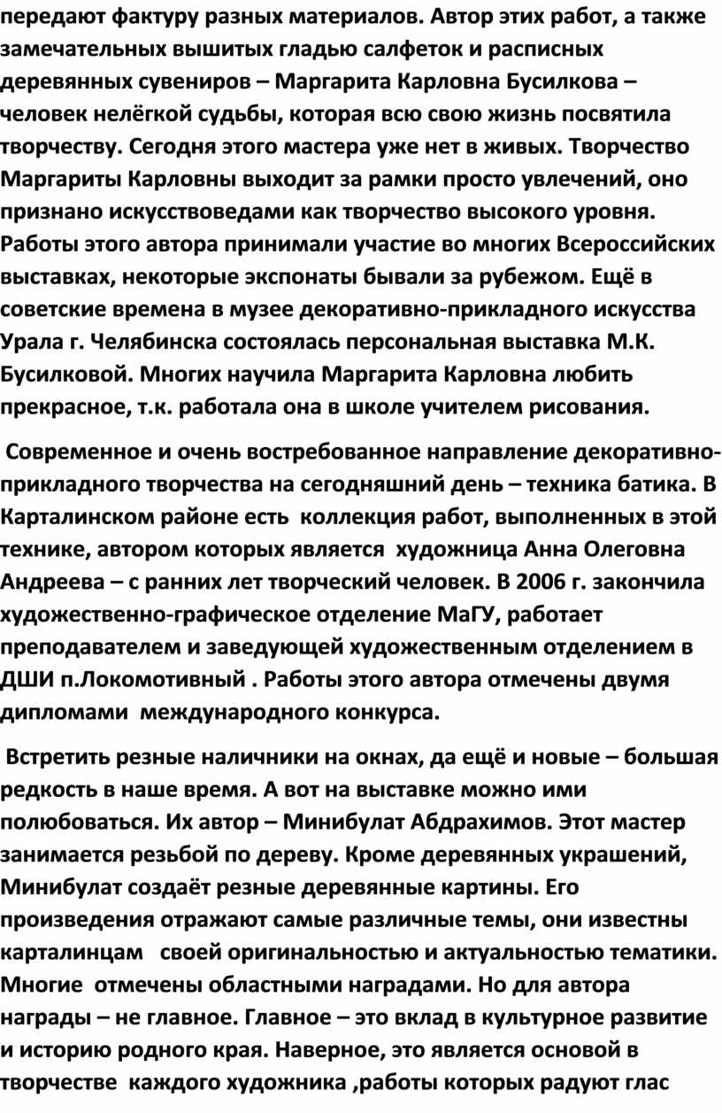 Некоторые работы художников могут ввести зрителя в заблуждение. Мы видим керамический сосуд, штоф из непрозрачного стекла, деревянные расписные стаканы для карандашей. На самом же деле все эти предметы выполнены… из бумаги. То есть техникой папье-маше. Да так искусно, что передают фактуру разных материалов. Автор этих работ, а также замечательных вышитых гладью салфеток и расписных деревянных сувениров – Маргарита Карловна Бусилкова – человек нелёгкой судьбы, которая всю свою жизнь посвятила творчеству. Сегодня этого мастера уже нет в живых. Творчество Маргариты Карловны выходит за рамки просто увлечений, оно признано искусствоведами как творчество высокого уровня. Работы этого автора принимали участие во многих Всероссийских выставках, некоторые экспонаты бывали за рубежом. Ещё в советские времена в музее декоративно-прикладного искусства Урала г. Челябинска состоялась персональная выставка М.К. Бусилковой. Многих научила Маргарита Карловна любить прекрасное, т.к. работала она в школе учителем рисования.