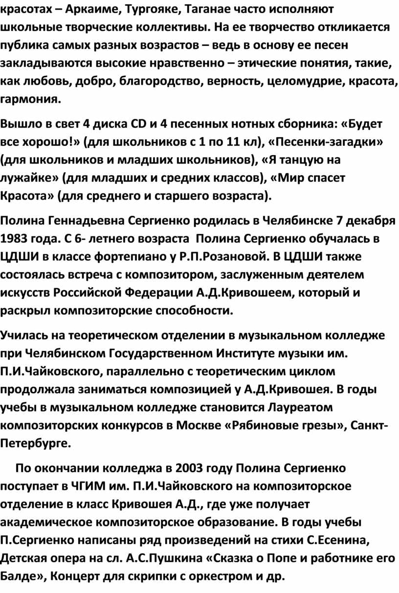 Полина Геннадьевна Сергиенко родилась в Челябинске 7 декабря 1983 года. С 6- летнего возраста Полина Сергиенко обучалась в ЦДШИ в классе фортепиано у Р.П.Розановой. В ЦДШИ также состоялась встреча с композитором, заслуженным деятелем искусств Российской Федерации А.Д.Кривошеем, который и раскрыл композиторские способности.