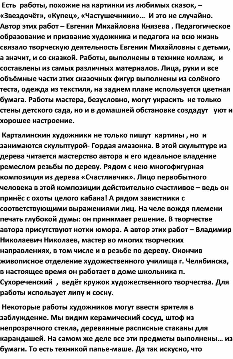 Карталинскин художники не только пишут картины , но и занимаются скульптурой- Гордая амазонка. В этой скульптуре из дерева читается мастерство автора и его идеальное владение ремеслом резьбы по дереву. Рядом с нею многофигурная композиция из дерева «Счастливчик». Лицо первобытного человека в этой композиции действительно счастливое – ведь он принёс с охоты целого кабана! А рядом завистники с соответствующими выражениями лиц. На челе вождя племени печать глубокой думы: он принимает решение. В творчестве автора присутствуют нотки юмора. А автор этих работ – Владимир Николаевич Николаев, мастер во многих творческих направлениях, в том числе и в резьбе по дереву. Окончив живописное отделение художественного училища г. Челябинска, в настоящее время он работает в доме школьника п. Сухореченский , ведёт кружок художественного творчества. Для работы использует липу и сосну.