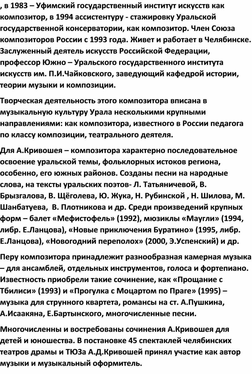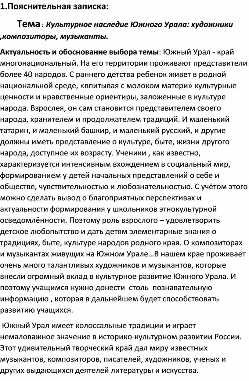 Актуальность и обоснование выбора темы: Южный Урал - край многонациональный. На его территории проживают представители более 40 народов. С раннего детства ребенок живет в родной национальной среде, «впитывая с молоком матери» культурные ценности и нравственные ориентиры, заложенные в культуре народа. Взрослея, он сам становится представителем своего народа, хранителем и продолжателем традиций. И маленький татарин, и маленький башкир, и маленький русский, и другие должны иметь представление о культуре, быте, жизни другого народа, доступное их возрасту. Ученики , как известно, характеризуется интенсивным вхождением в социальный мир, формированием у детей начальных представлений о себе и обществе, чувствительностью и любознательностью. С учётом этого можно сделать вывод о благоприятных перспективах и актуальности формирования у школьников этнокультурной осведомлённости. Поэтому роль взрослого – удовлетворить детское любопытство и дать детям элементарные знания о традициях, быте, культуре народов родного края. О композиторах и музыкантах живущих на Южном Урале…В нашем крае проживает очень много талантливых художников и музыкантов, которые внесли огромный вклад в культурное развитие Южного Урала. И поэтому учащимся нужно донести столь познавательную информацию , которая в дальнейшем будет способствовать развитию учащихся.