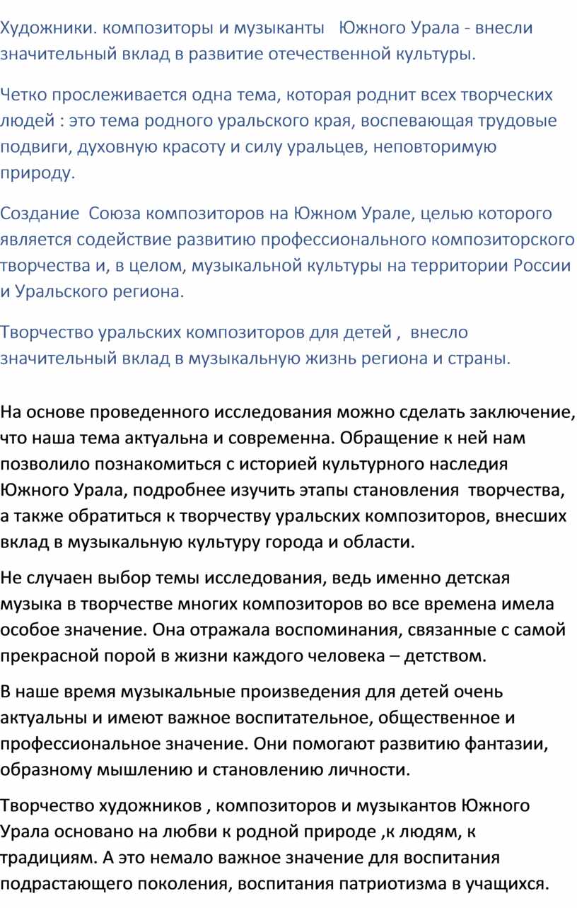 Творчество художников , композиторов и музыкантов Южного Урала основано на любви к родной природе ,к людям, к традициям. А это немало важное значение для воспитания подрастающего поколения, воспитания патриотизма в учащихся.