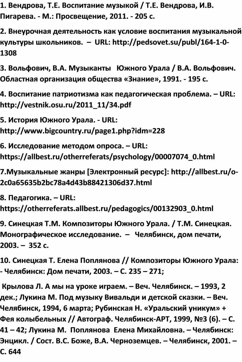 1. Вендрова, Т.Е. Воспитание музыкой / Т.Е. Вендрова, И.В. Пигарева. - М.: Просвещение, 2011. - 205 c.