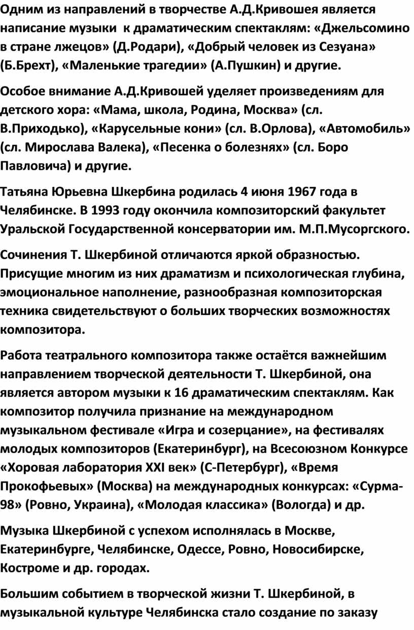 Для А.Кривошея – композитора характерно последовательное освоение уральской темы, фольклорных истоков региона, особенно, его южных районов. Созданы песни на народные слова, на тексты уральских поэтов- Л. Татьяничевой, В. Брызгалова, В. Щёголева, Ю. Жука, Н. Рубинской , Н. Шилова, М. Шанбатуева, В. Плотникова и др. Среди произведений крупных форм – балет «Мефистофель» (1992), мюзиклы «Маугли» (1994, либр. Е.Ланцова), «Новые приключения Буратино» (1995, либр. Е.Ланцова), «Новогодний переполох» (2000, Э.Успенский) и др.