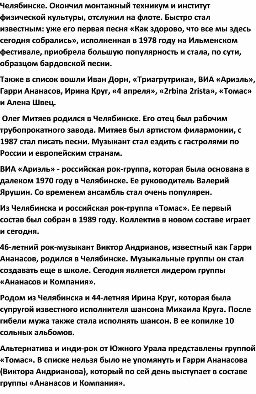 Челябинская область - родина многих известных людей. Среди них актеры, спортсмены, политики и, конечно, музыканты.