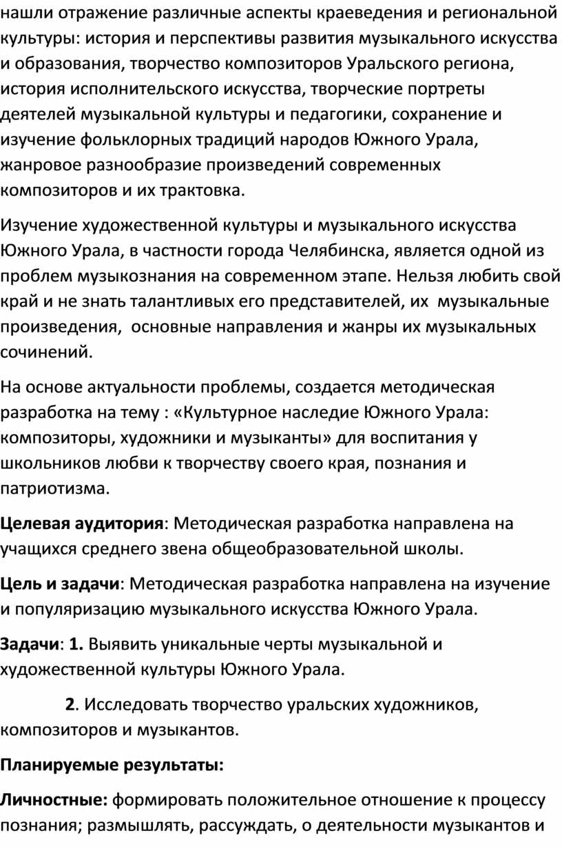 Цель и задачи: Методическая разработка направлена на изучение и популяризацию музыкального искусства Южного Урала.