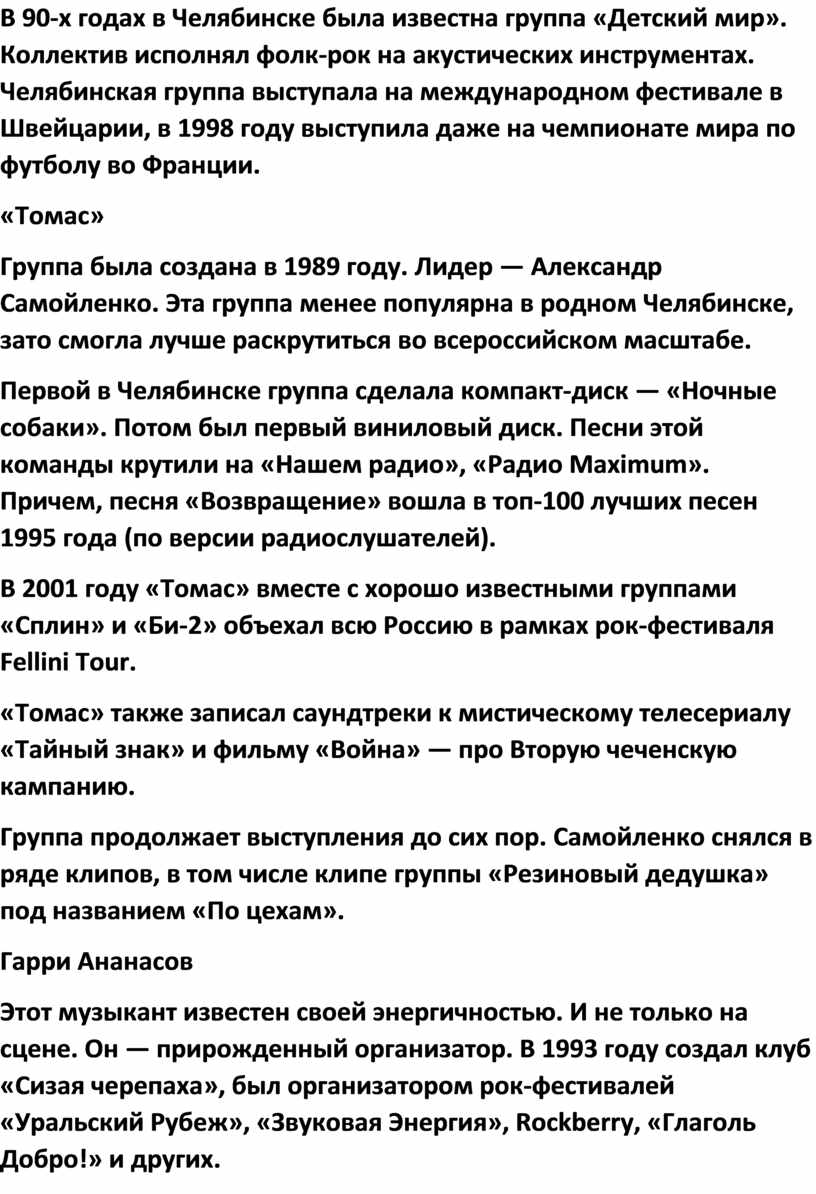 В 90-х годах в Челябинске была известна группа «Детский мир». Коллектив исполнял фолк-рок на акустических инструментах. Челябинская группа выступала на международном фестивале в Швейцарии, в 1998 году выступила даже на чемпионате мира по футболу во Франции.