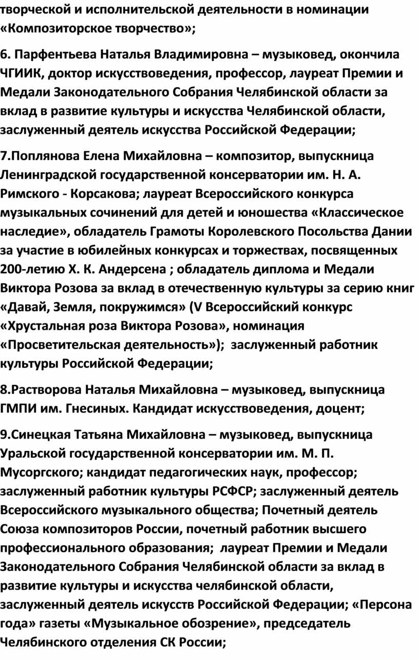 Южно-Уральская земля взрастила целую плеяду музыкантов, многие из которых внесли значительный вклад в развитие отечественной музыки -это В.Крылов (основоположник профессионального обучения игре на баяне), Н.Факторович (один из создателей симфонического оркестра филармонии), Е.Филиппова (многие годы являлась главным дирижером театра оперетты), И.Зак (заложил прочный фундамент в деятельность Челябинского театра оперы и балета имени М.И.Глинки), С.Г.Эйдинов — музыкант-легенда (создатель первой профессиональной хоровой капеллы), составляют гордость культуры Южного Урала.