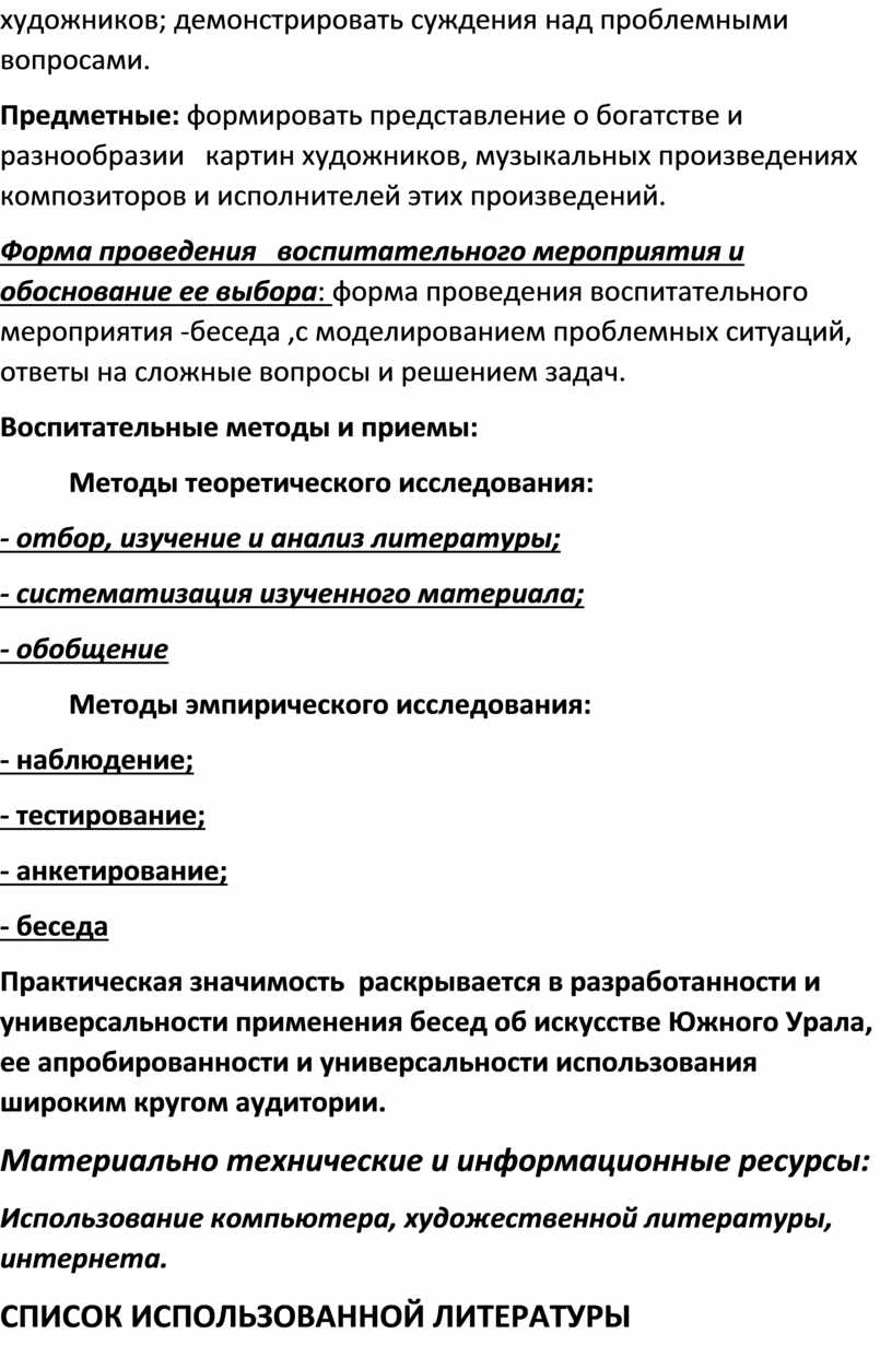 Практическая значимость раскрывается в разработанности и универсальности применения бесед об искусстве Южного Урала, ее апробированности и универсальности использования широким кругом аудитории.