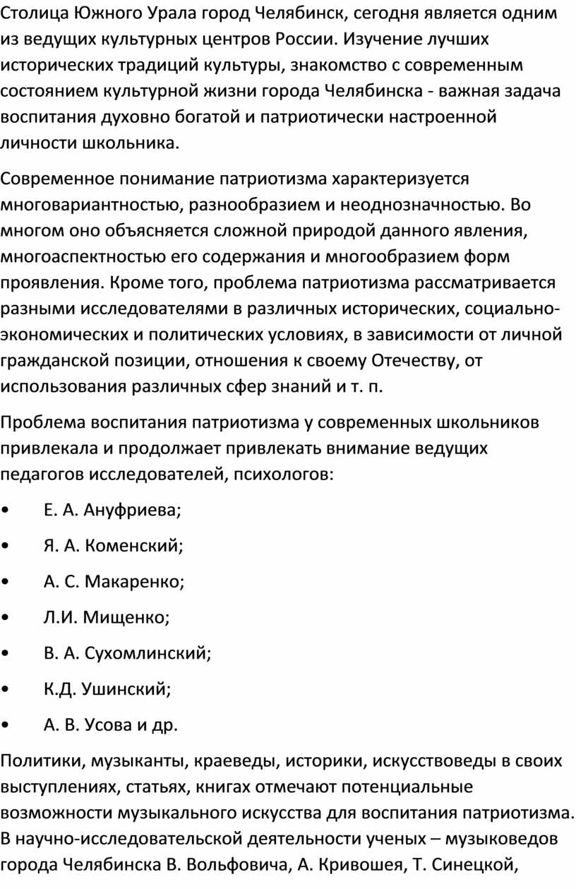 Политики, музыканты, краеведы, историки, искусствоведы в своих выступлениях, статьях, книгах отмечают потенциальные возможности музыкального искусства для воспитания патриотизма. В научно-исследовательской деятельности ученых – музыковедов города Челябинска В. Вольфовича, А. Кривошея, Т. Синецкой, нашли отражение различные аспекты краеведения и региональной культуры: история и перспективы развития музыкального искусства и образования, творчество композиторов Уральского региона, история исполнительского искусства, творческие портреты деятелей музыкальной культуры и педагогики, сохранение и изучение фольклорных традиций народов Южного Урала, жанровое разнообразие произведений современных композиторов и их трактовка.