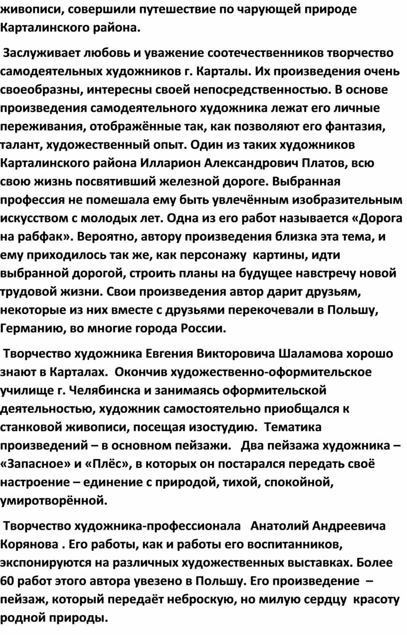 Вниманию присутствующих были представлены картины Карталинских художников И.Платова, Е.Шаламова, С. Ганиной, В. Ганина, П. Струкова, М.Баталова, А. Ординой. Гости узнали о жизни и творчестве художников. Через прекрасный мир живописи, совершили путешествие по чарующей природе Карталинского района.