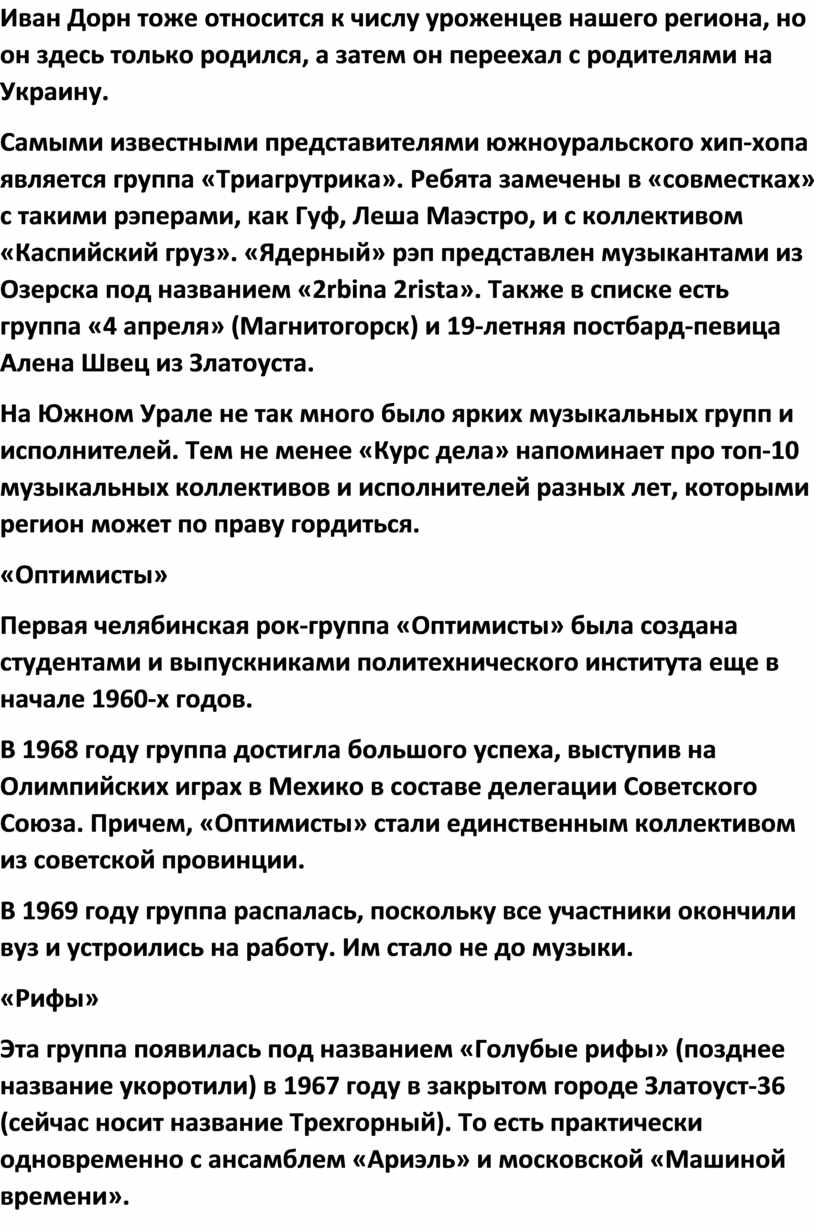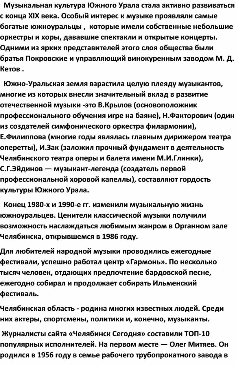 Южный Урал имеет колоссальные традиции и играет немаловажное значение в историко-культурном развитии России. Этот удивительный творческий край дал миру известных музыкантов, композиторов, писателей, художников, ученых и других выдающихся деятелей литературы и искусства.