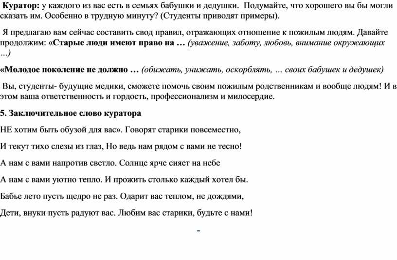 Куратор: у каждого из вас есть в семьях бабушки и дедушки. Подумайте, что хорошего вы бы могли сказать им. Особенно в трудную минуту? (Студенты приводят примеры).