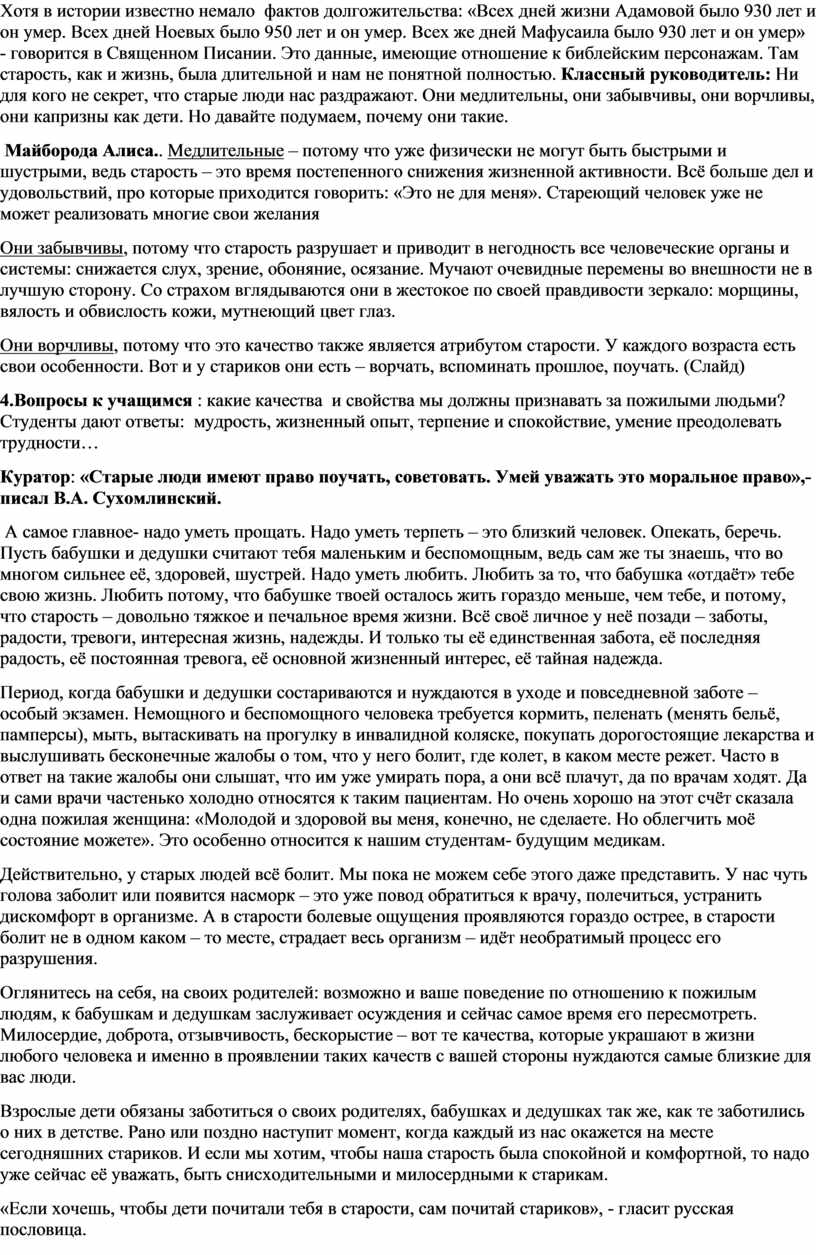 Хотя в истории известно немало фактов долгожительства: «Всех дней жизни Адамовой было 930 лет и он умер. Всех дней Ноевых было 950 лет и он умер. Всех же дней Мафусаила было 930 лет и он умер» - говорится в Священном Писании. Это данные, имеющие отношение к библейским персонажам. Там старость, как и жизнь, была длительной и нам не понятной полностью. Классный руководитель: Ни для кого не секрет, что старые люди нас раздражают. Они медлительны, они забывчивы, они ворчливы, они капризны как дети. Но давайте подумаем, почему они такие.