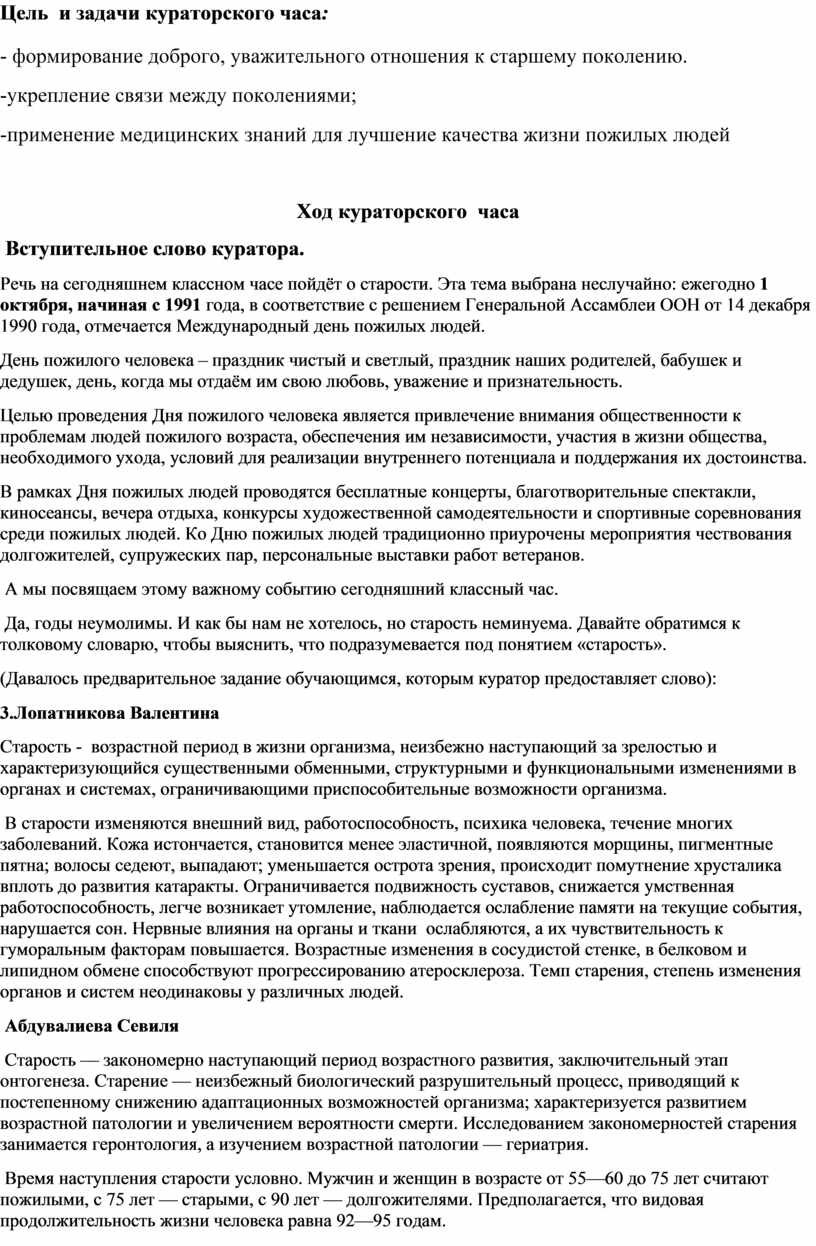 Речь на сегодняшнем классном часе пойдёт о старости. Эта тема выбрана неслучайно: ежегодно 1 октября, начиная с 1991 года, в соответствие с решением Генеральной Ассамблеи ООН от 14 декабря 1990 года, отмечается Международный день пожилых людей.