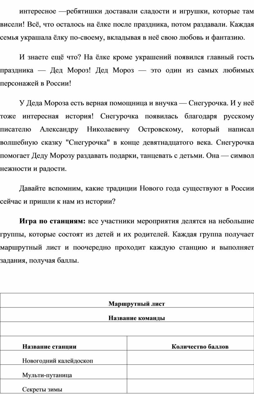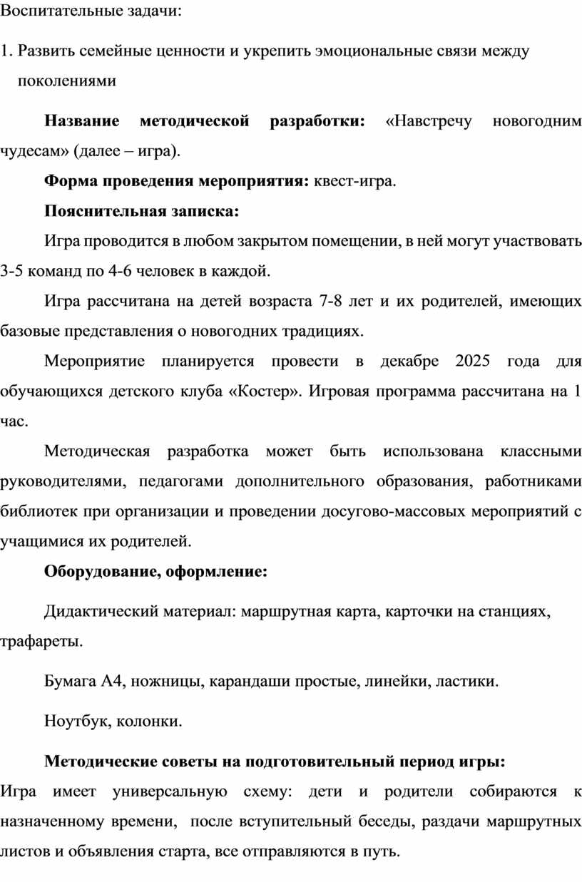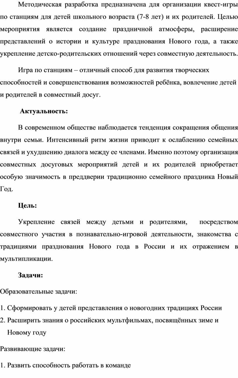 Методическая разработка предназначена для организации квест-игры по станциям для детей школьного возраста (7-8 лет) и их родителей. Целью мероприятия является создание праздничной атмосферы, расширение представлений о истории и культуре празднования Нового года, а также укрепление детско-родительских отношений через совместную деятельность.