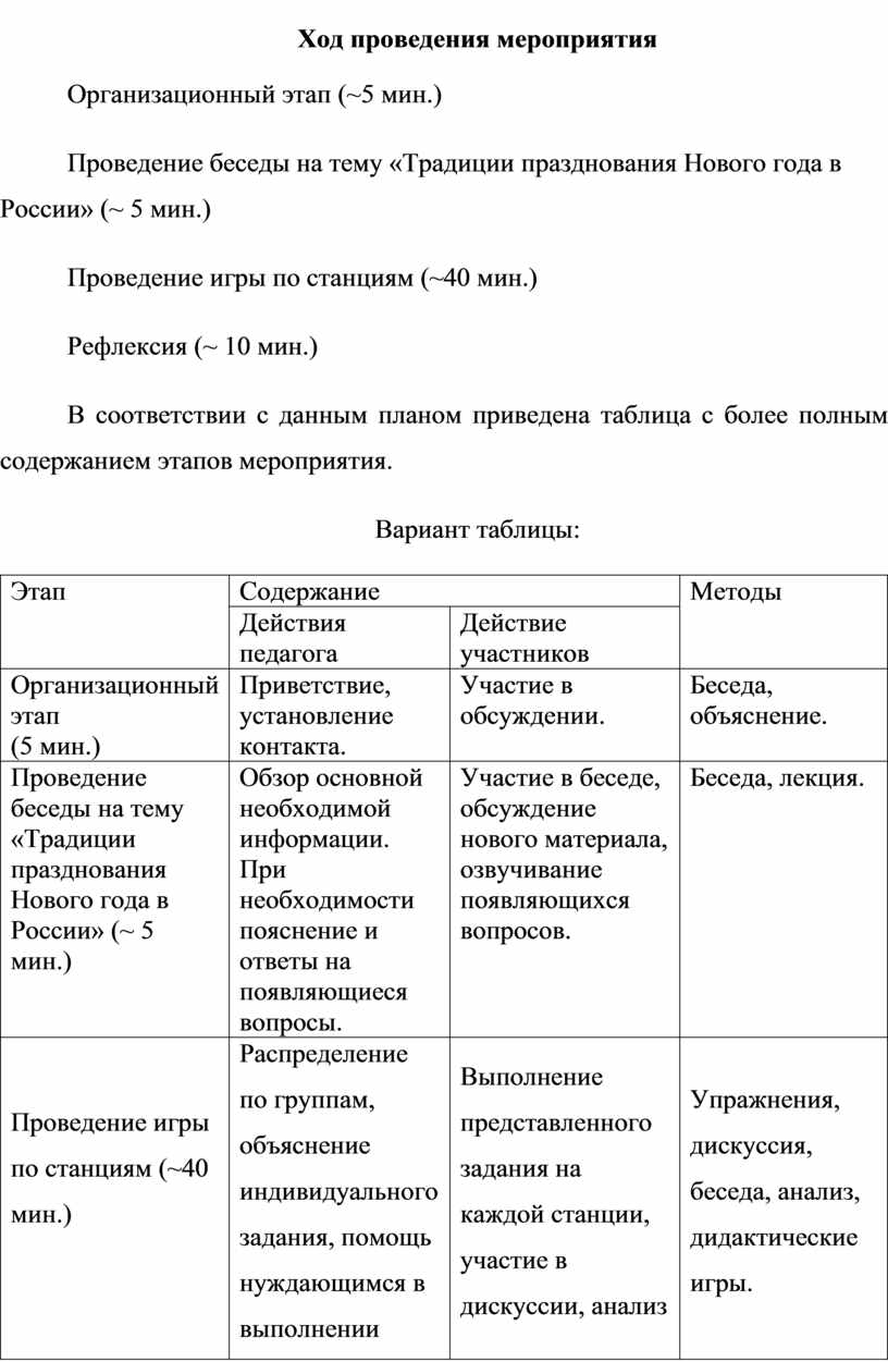 В соответствии с данным планом приведена таблица с более полным содержанием этапов мероприятия.