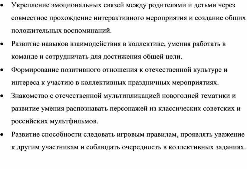 · Укрепление эмоциональных связей между родителями и детьми через совместное прохождение интерактивного мероприятия и создание общих положительных воспоминаний.