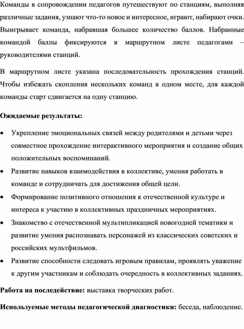 Команды в сопровождении педагогов путешествуют по станциям, выполняя различные задания, узнают что-то новое и интересное, играют, набирают очки. Выигрывает команда, набравшая большее количество баллов. Набранные командой баллы фиксируются в маршрутном листе педагогами – руководителями станций.