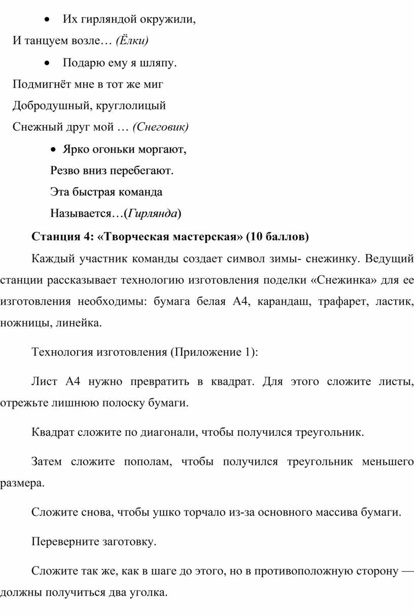Каждый участник команды создает символ зимы- снежинку. Ведущий станции рассказывает технологию изготовления поделки «Снежинка» для ее изготовления необходимы: бумага белая А4, карандаш, трафарет, ластик, ножницы, линейка.