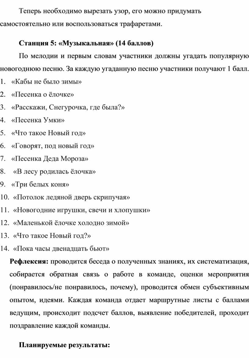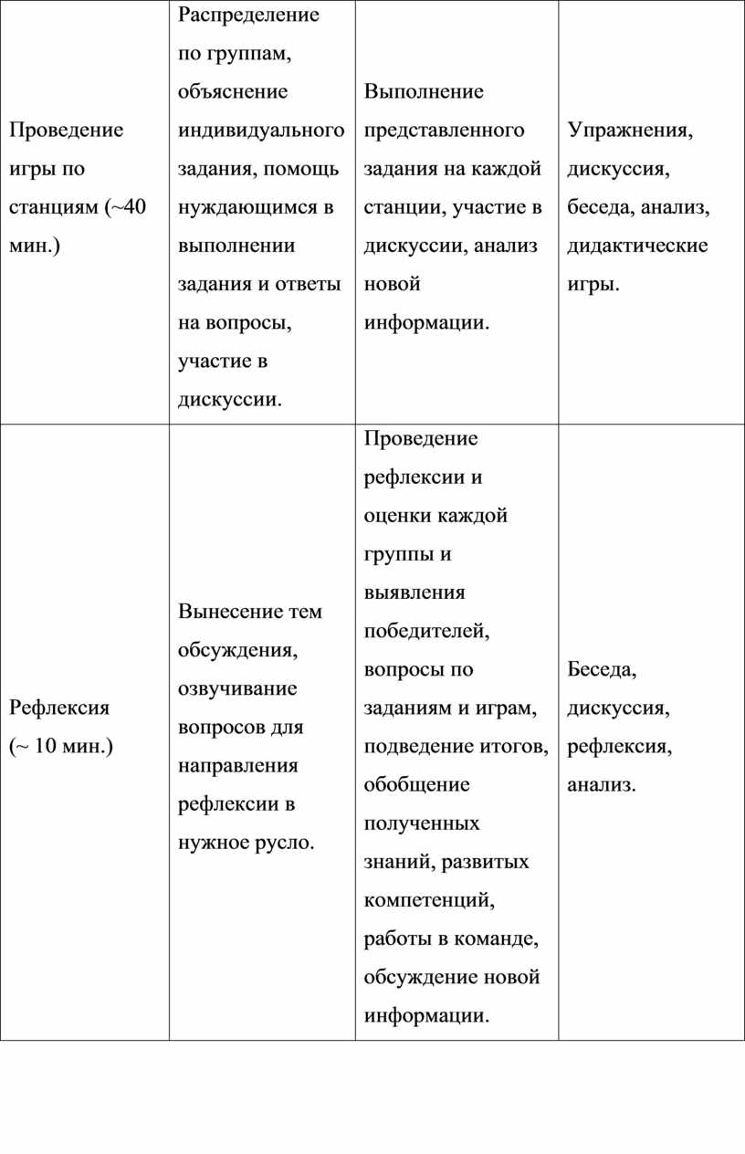 Рефлексия: проводится беседа о полученных знаниях, их систематизация, собирается обратная связь о работе в команде, оценки мероприятия (понравилось/не понравилось, почему), проводится обмен субъективным опытом, идеями. Каждая команда отдает маршрутные листы с баллами ведущим, происходит подсчет баллов, выявление победителей, проходит поздравление каждой команды.