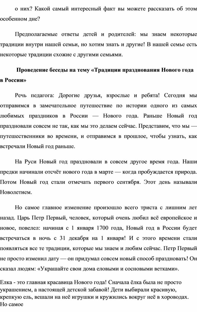 Речь педагога: Дорогие друзья, взрослые и ребята! Сегодня мы отправимся в замечательное путешествие по истории одного из самых любимых праздников в России — Нового года. Раньше Новый год праздновали совсем не так, как мы это делаем сейчас. Представим, что мы — путешественники во времени, и отправимся в прошлое, чтобы узнать, как встречали Новый год раньше.