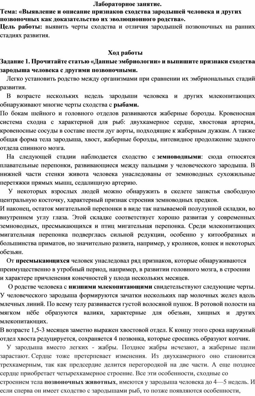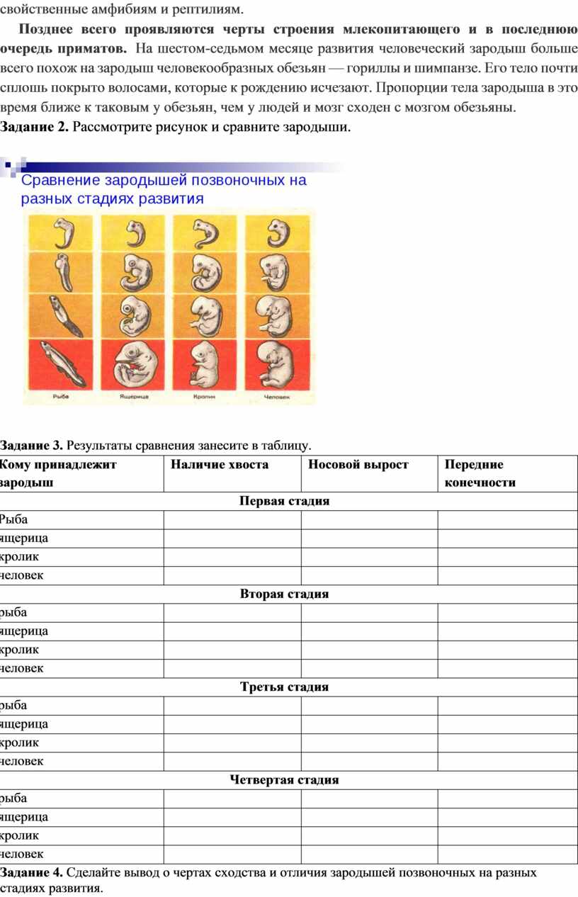 Задание 1. Прочитайте статью «Данные эмбриологии» и выпишите признаки сходства зародыша человека с другими позвоночными.