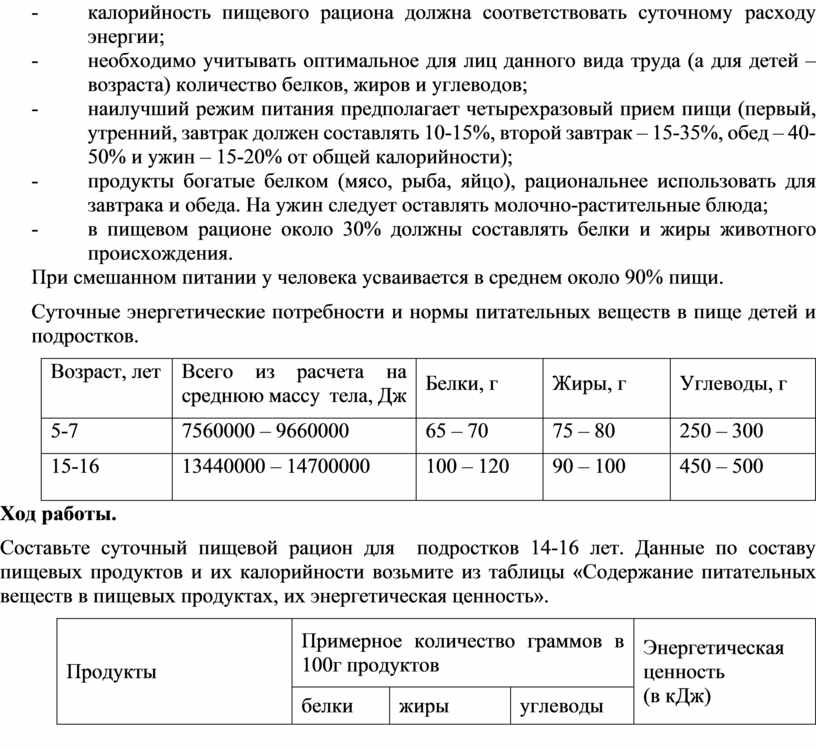 Составьте суточный пищевой рацион для  подростков 14-16 лет. Данные по составу пищевых продуктов и их калорийности возьмите из таблицы «Содержание питательных веществ в пищевых продуктах, их энергетическая ценность».