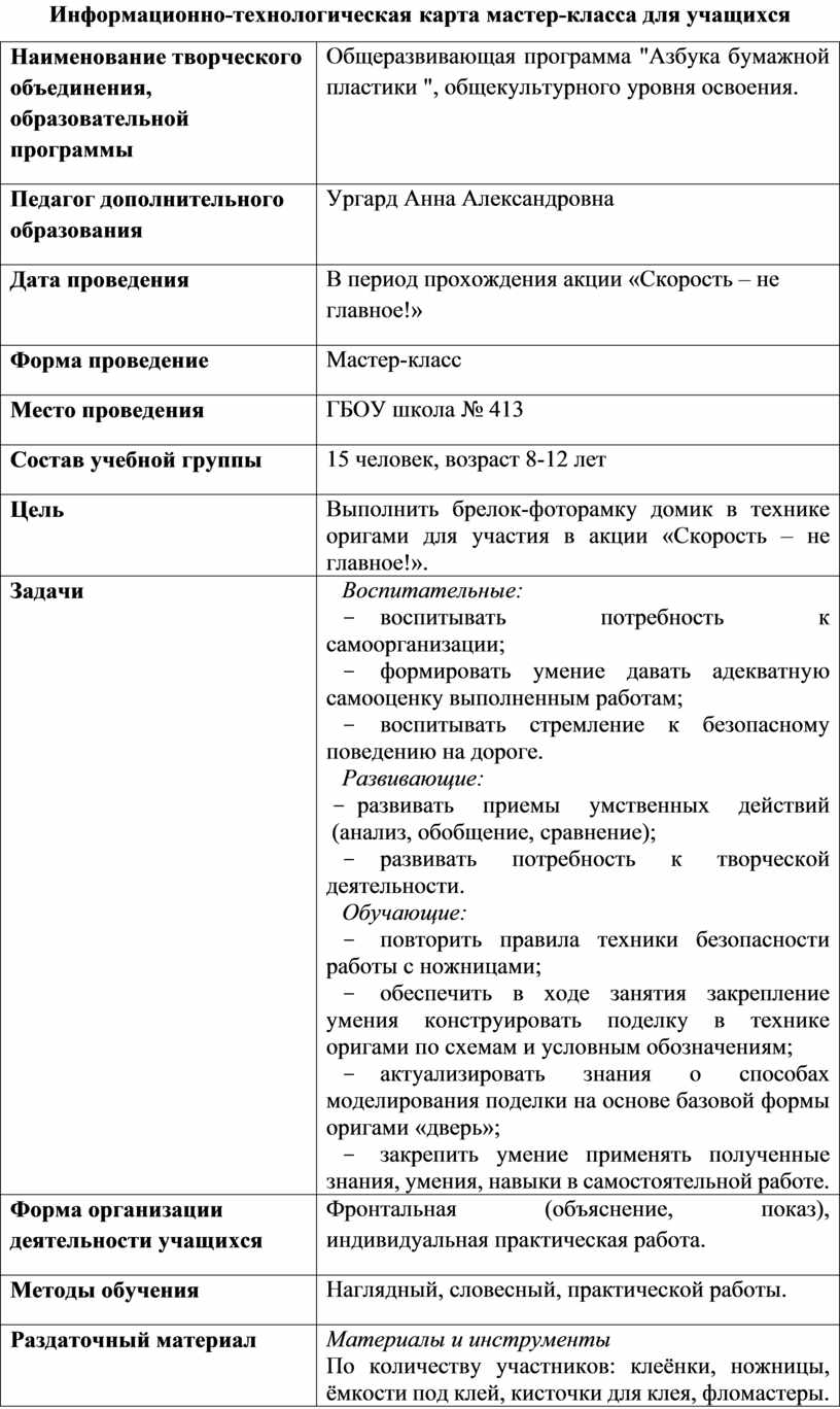 Воспитательные: воспитывать потребность к самоорганизации; формировать умение давать адекватную самооценку выполненным работам; воспитывать стремление к безопасному поведению на дороге. Развивающие: развивать приемы умственных действий (анализ, обобщение, сравнение); развивать потребность к творческой деятельности. Обучающие: повторить правила техники безопасности работы с ножницами; обеспечить в ходе занятия закрепление умения конструировать поделку в технике оригами по схемам и условным обозначениям; актуализировать знания о способах моделирования поделки на основе базовой формы оригами «дверь»; закрепить умение применять полученные знания, умения, навыки в самостоятельной работе. |