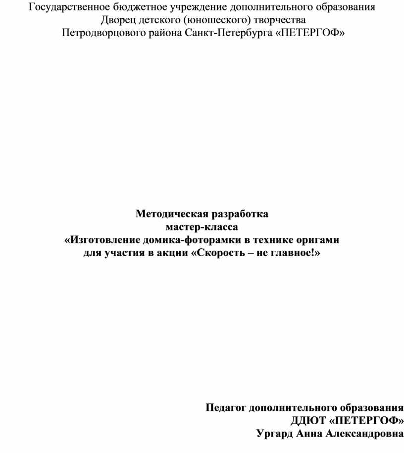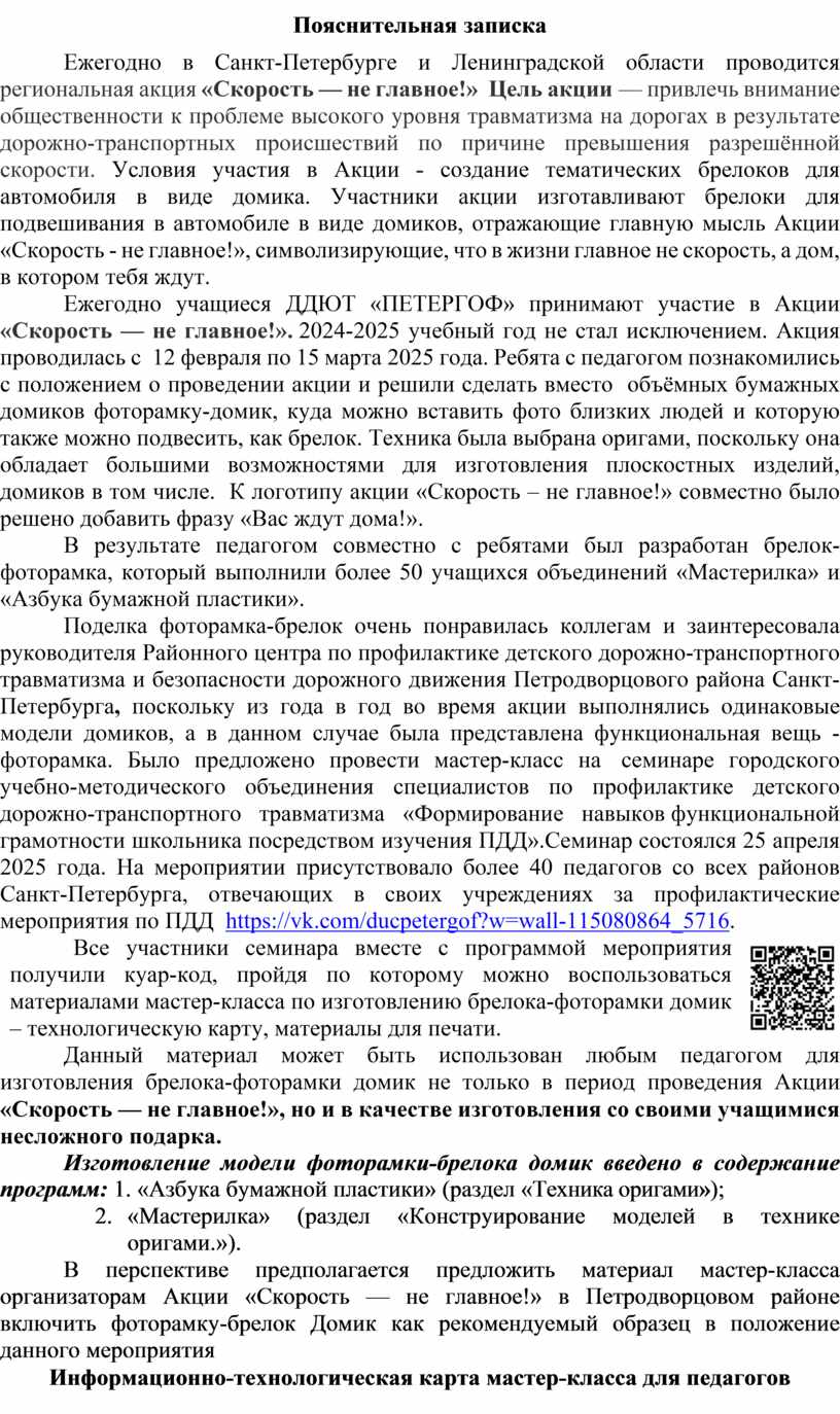Ежегодно учащиеся ДДЮТ «ПЕТЕРГОФ» принимают участие в Акции «Скорость — не главное!». 2024-2025 учебный год не стал исключением. Акция проводилась с 12 февраля по 15 марта 2025 года. Ребята с педагогом познакомились с положением о проведении акции и решили сделать вместо объёмных бумажных домиков фоторамку-домик, куда можно вставить фото близких людей и которую также можно подвесить, как брелок. Техника была выбрана оригами, поскольку она обладает большими возможностями для изготовления плоскостных изделий, домиков в том числе. К логотипу акции «Скорость – не главное!» совместно было решено добавить фразу «Вас ждут дома!».
