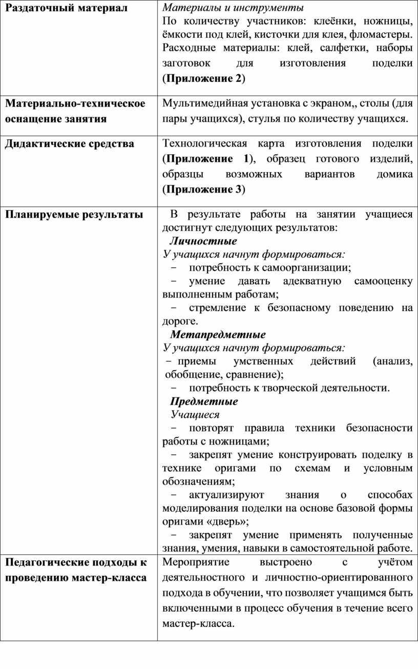 В результате работы на занятии учащиеся достигнут следующих результатов: Личностные У учащихся начнут формироваться: потребность к самоорганизации; умение давать адекватную самооценку выполненным работам; стремление к безопасному поведению на дороге. Метапредметные У учащихся начнут формироваться: приемы умственных действий (анализ, обобщение, сравнение); потребность к творческой деятельности. Предметные Учащиеся повторят правила техники безопасности работы с ножницами; закрепят умение конструировать поделку в технике оригами по схемам и условным обозначениям; актуализируют знания о способах моделирования поделки на основе базовой формы оригами «дверь»; закрепят умение применять полученные знания, умения, навыки в самостоятельной работе. |