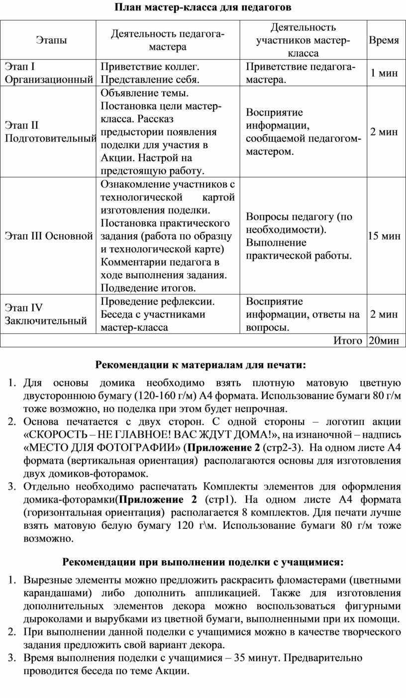 Рекомендации к материалам для печати: 1. Для основы домика необходимо взять плотную матовую цветную двустороннюю бумагу (120-160 г/м) А4 формата. Использование бумаги 80 г/м тоже возможно, но поделка при этом будет непрочная. 2. Основа печатается с двух сторон. С одной стороны – логотип акции «СКОРОСТЬ – НЕ ГЛАВНОЕ! ВАС ЖДУТ ДОМА!», на изнаночной – надпись «МЕСТО ДЛЯ ФОТОГРАФИИ» (Приложение 2 (стр2-3). На одном листе А4 формата (вертикальная ориентация) располагаются основы для изготовления двух домиков-фоторамок. 3. Отдельно необходимо распечатать Комплекты элементов для оформления домика-фоторамки(Приложение 2 (стр1). На одном листе А4 формата (горизонтальная ориентация) располагается 8 комплектов. Для печати лучше взять матовую белую бумагу 120 г\м. Использование бумаги 80 г/м тоже возможно. Рекомендации при выполнении поделки с учащимися: 1. Вырезные элементы можно предложить раскрасить фломастерами (цветными карандашами) либо дополнить аппликацией. Также для изготовления дополнительных элементов декора можно воспользоваться фигурными дыроколами и вырубками из цветной бумаги, выполненными при их помощи. 2. При выполнении данной поделки с учащимися можно в качестве творческого задания предложить свой вариант декора. 3. Время выполнения поделки с учащимися – 35 минут. Предварительно проводится беседа по теме Акции. |