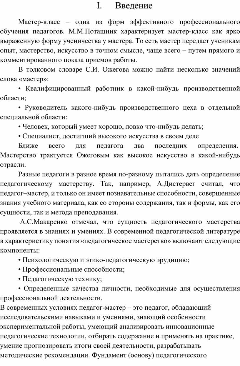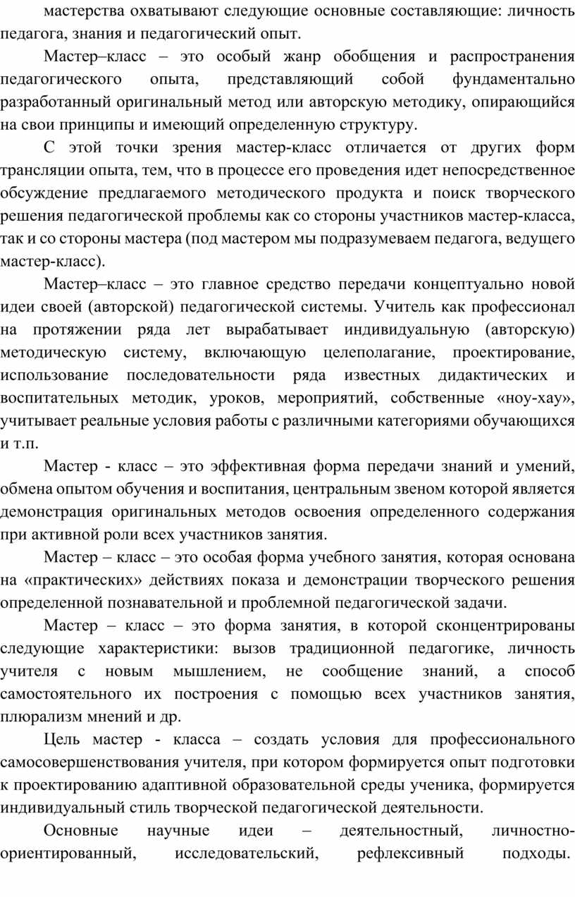 Мастер-класс – одна из форм эффективного профессионального обучения педагогов. М.М.Поташник характеризует мастер-класс как ярко выраженную форму ученичества у мастера. То есть мастер передает ученикам опыт, мастерство, искусство в точном смысле, чаще всего – путем прямого и комментированного показа приемов работы.
