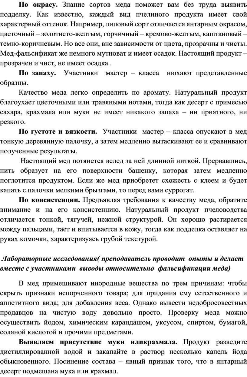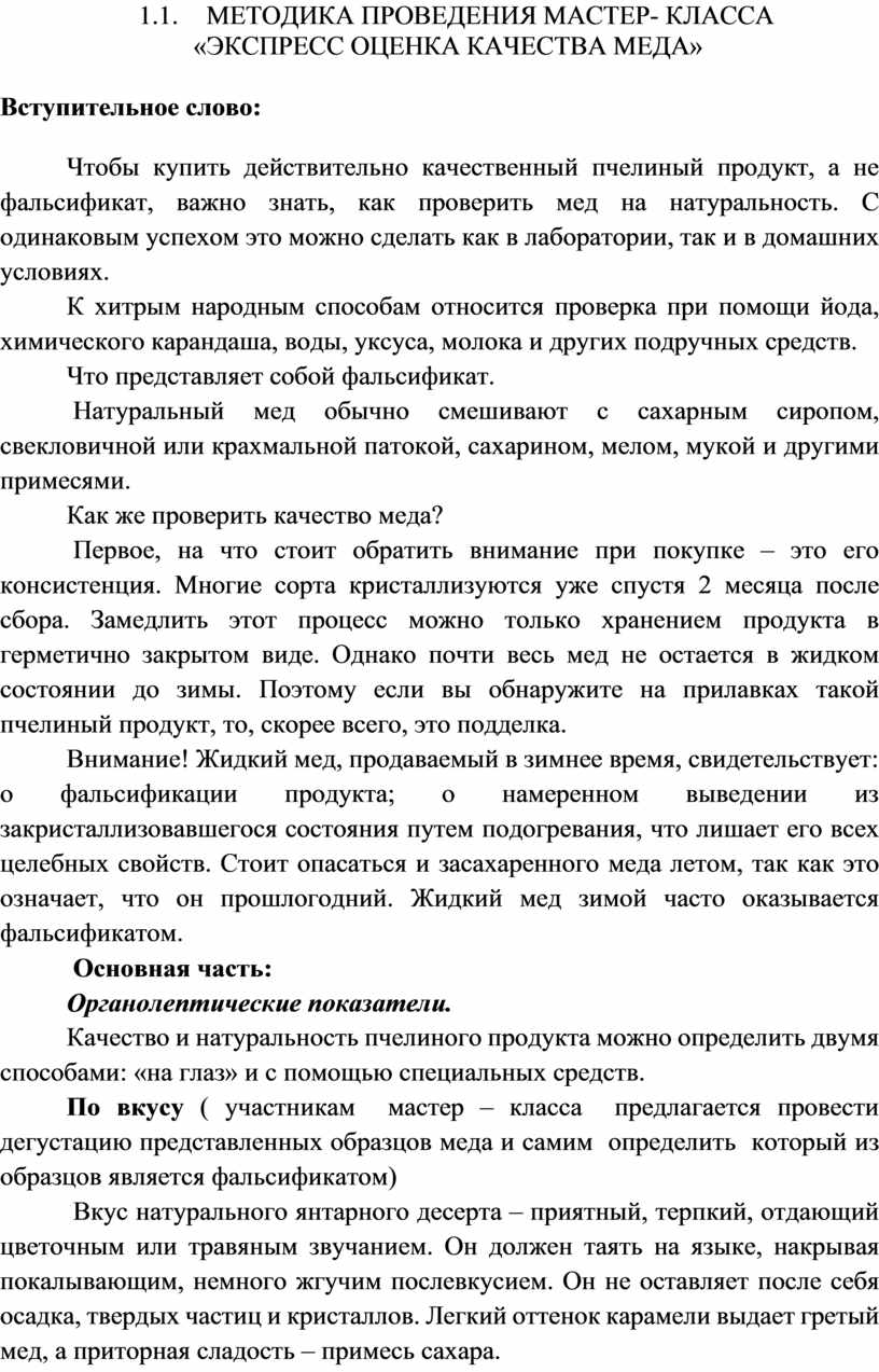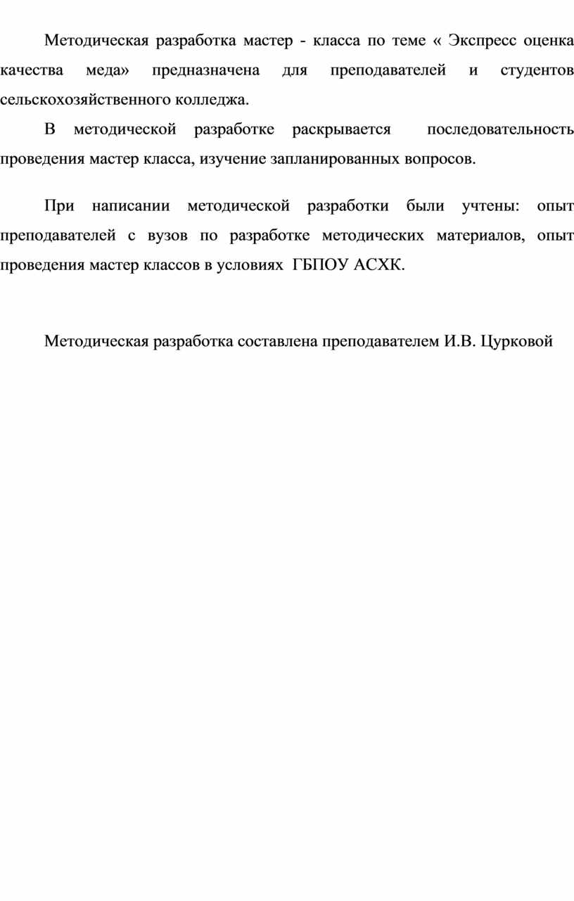 Методическая разработка мастер - класса по теме « Экспресс оценка качества меда» предназначена для преподавателей и студентов сельскохозяйственного колледжа.