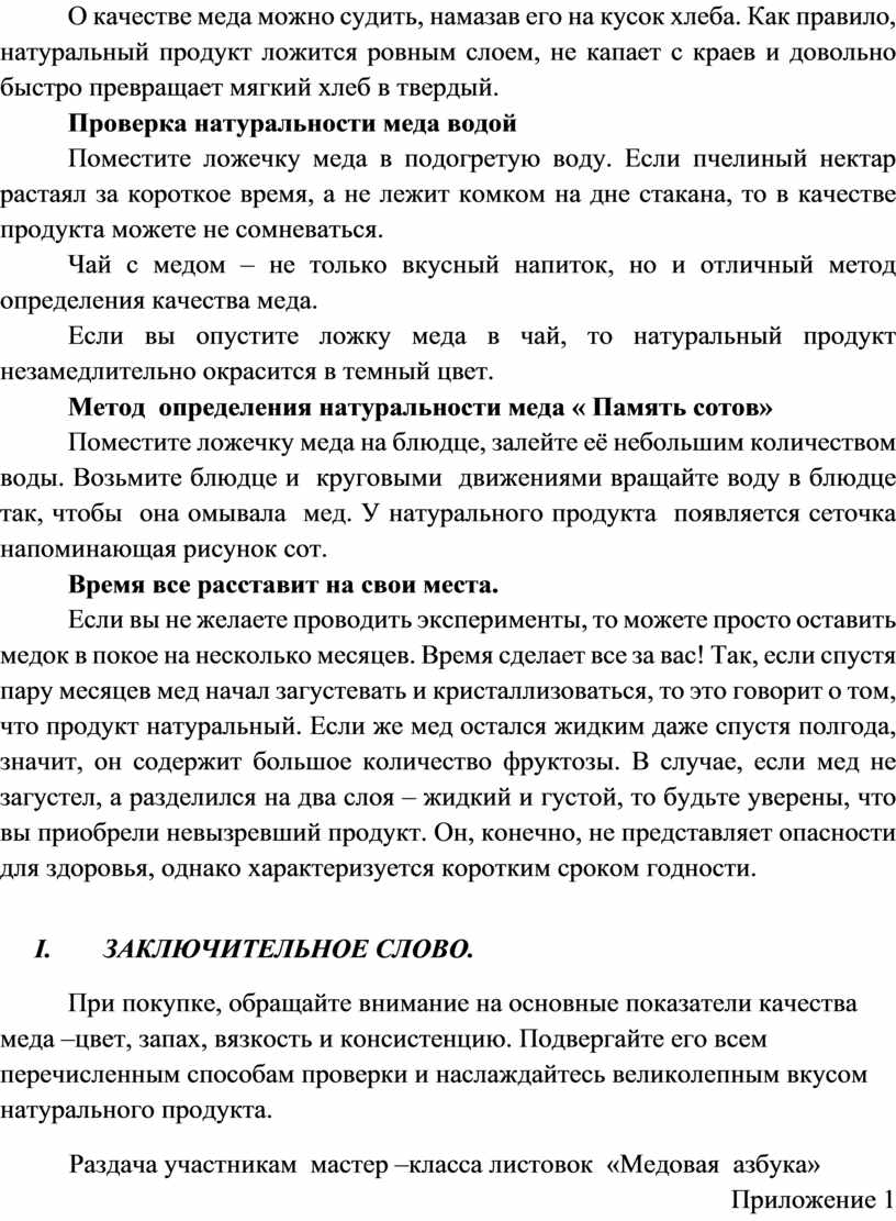 2. Основная часть : изложение материала в сочетании с беседой и демонстрацией методов определения качества меда. (15мин.)