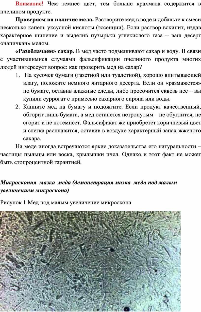 В мед примешивают инородные вещества по трем причинам: чтобы скрыть признаки испорченного товара; для придания ему естественного и аппетитного вида; для добавления веса. Однако вывести недобросовестных продавцов на чистую воду довольно просто. Проверку меда можно осуществить йодом, химическим карандашом, уксусом, спиртом, бумагой, соляной кислотой и прочими предметами.