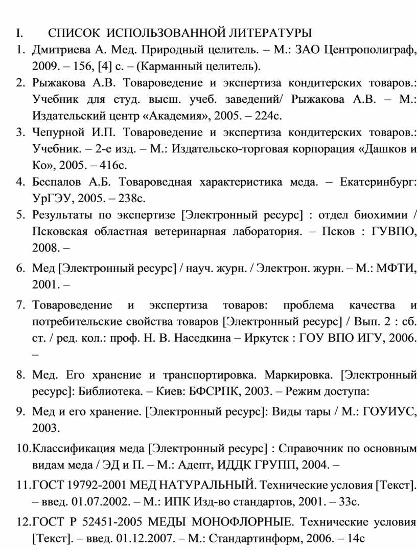 11. ГОСТ 19792-2001 МЕД НАТУРАЛЬНЫЙ. Технические условия [Текст]. – введ. 01.07.2002. – М.: ИПК Изд-во стандартов, 2001. – 33с.